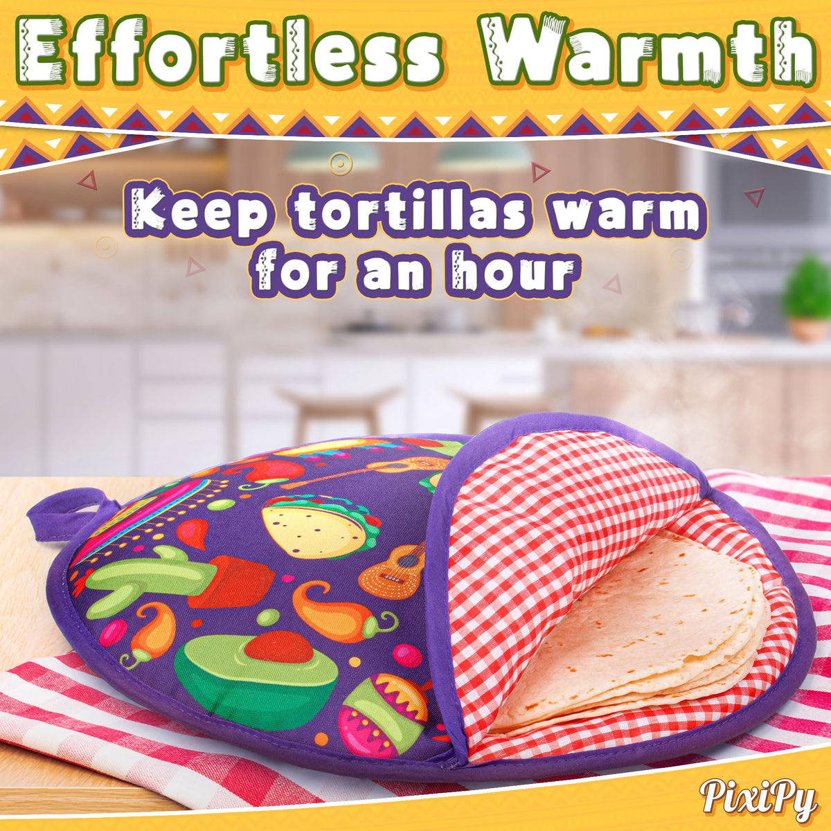 Q: How do I use the PixiPy Tortilla Warmer Pouch?A: To use the PixiPy Tortilla Warmer Pouch, simply place up to 15 corn or flour tortillas inside the pouch and microwave it for a few seconds until heated. The insulated design keeps the tortillas warm and soft for up to an hour, perfect for serving at your dinner table.