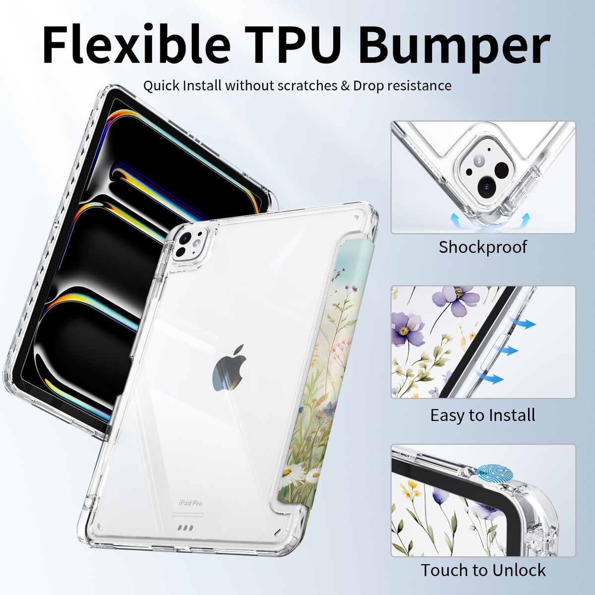 Piznernico Case For Ipad Pro 11 Inch M4 (2024, 5Th Generation) With Pencil Holder, Trifold Stand, Transparent Clear Back Cover,