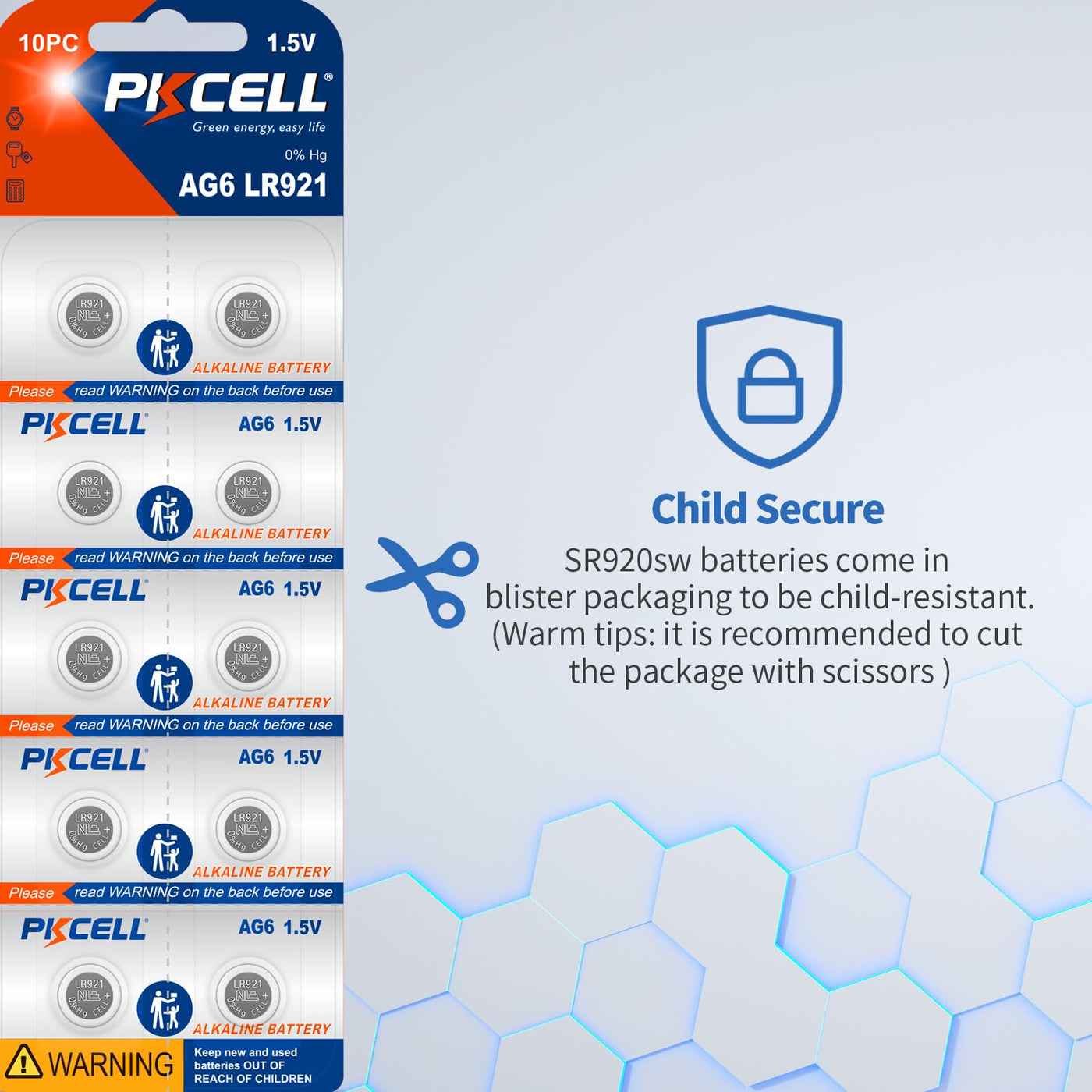 Specification: Model: Ag6/Sr920Sw Material: Metal Chemistry:Alkaline Standard Voltage: 1.5 Volt Capacity: 25 Mah Shelf Life: 3-Year Replacements: Ag6, Sr920W, Sr920Sw, 370, 371, Lr921,Sr921 Battery.
