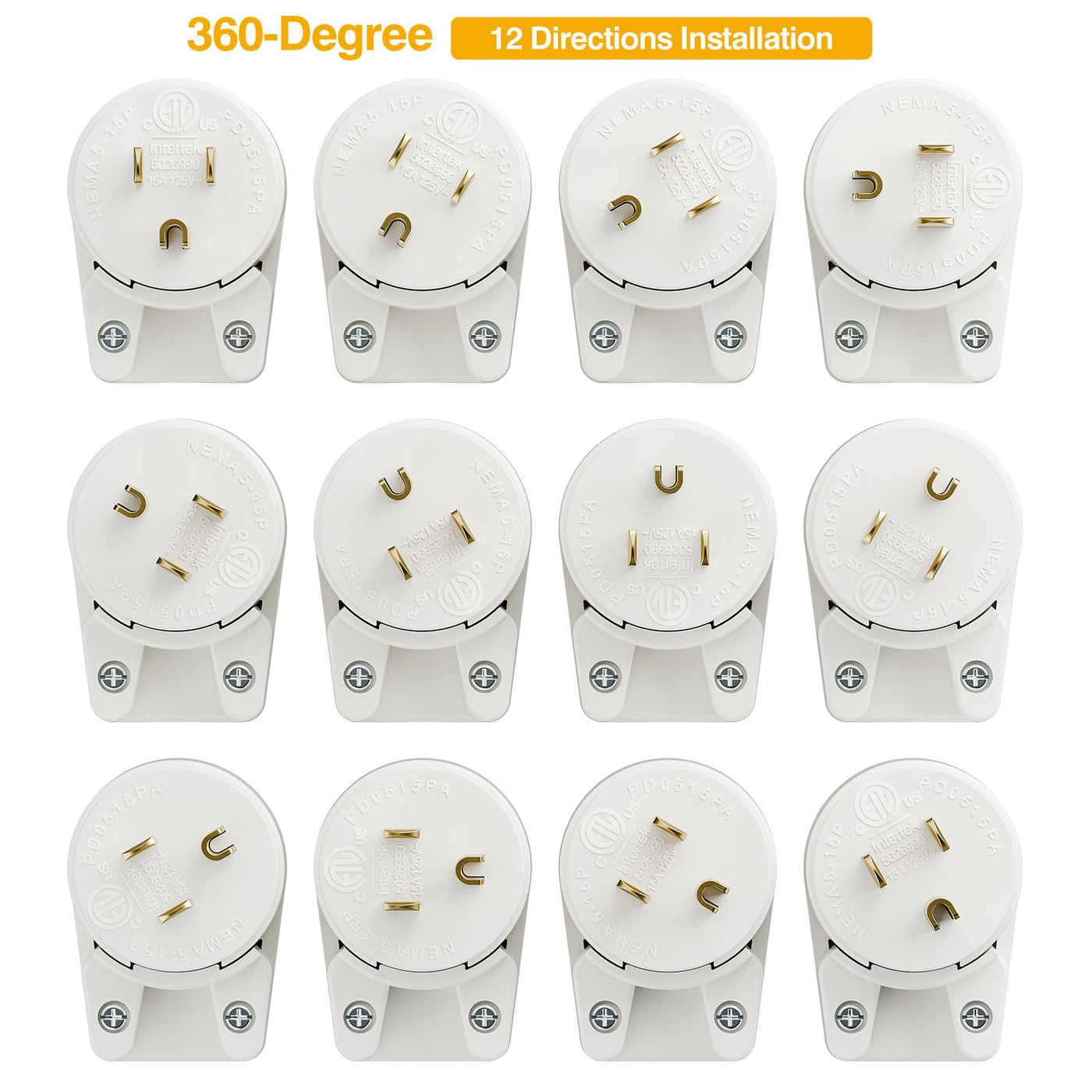 :Specification . Etl Certificated Nema 5-15P Male Ac Plug . Rated @15A 125V . Comply With American Cord Sjt Svt Sjtw 18Awg,16Awg & 14Awg And 12Awg Cables . Comply With European Cord 0.75/1.0/1.5/2.0 Square Mili-Meter Cable . Material: Nylon+ Pure Copper . 12 Directions Adjustable Ac Power Plug . White Color