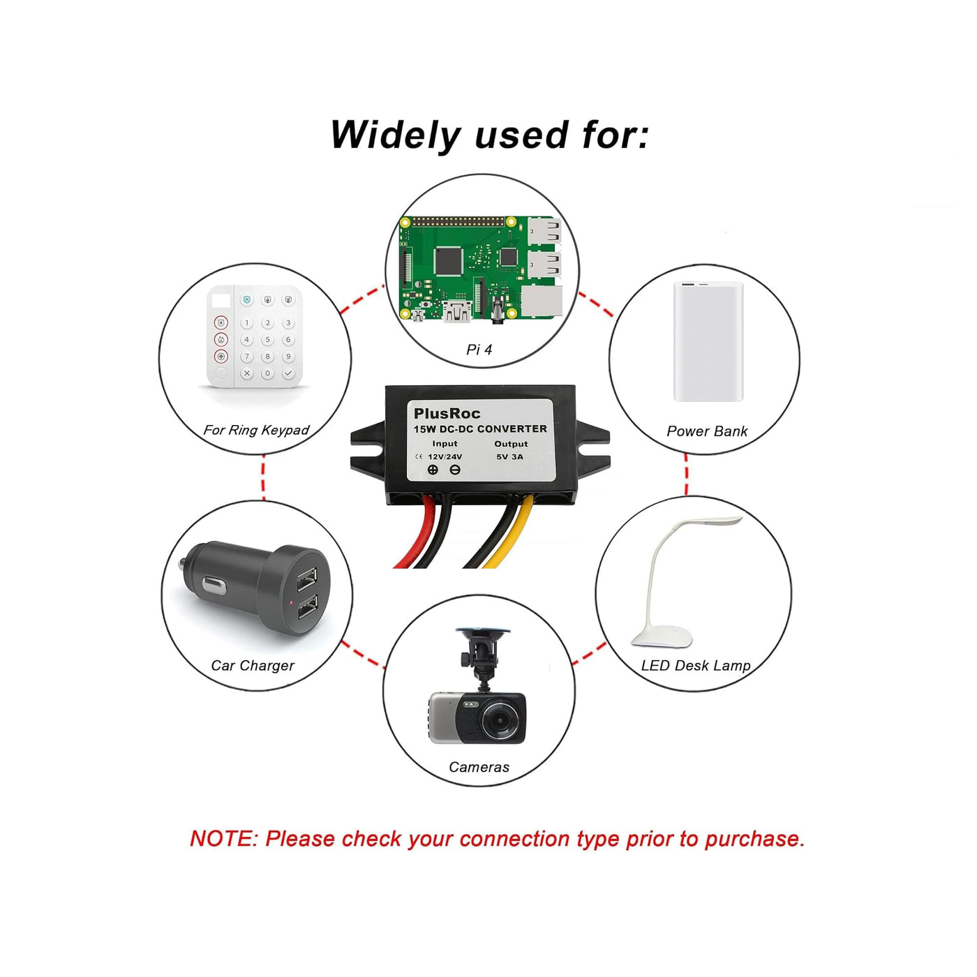 Plusroc 12V To 5V Converter Is Widely Used In Low Power Consumption Electronics The Enclosure Is Completely Sealed With Epoxy Resin, Providing Superior Protection Against Water Damagespecifications: Ip68 Waterproof Enclosure Efficiency: Higher Than 90% Non-Isolated Input Voltage: Dc 8-32V, (12V24V Is Recommend) Output Voltage: Dc 5V Output Current: Max 3A Power Rating: 15W Stable Performance Operating Temperature: -30 To 65(-22 To 149) Humidity Limits: 10%-90% Rh Size: 46Mm*27Mm*14Mm(L*W*H) 181 Inch * 106 Inch * 055 Inch Package Includes: 1Pcs Dc-Dc 12V To 5V Step Down Converter