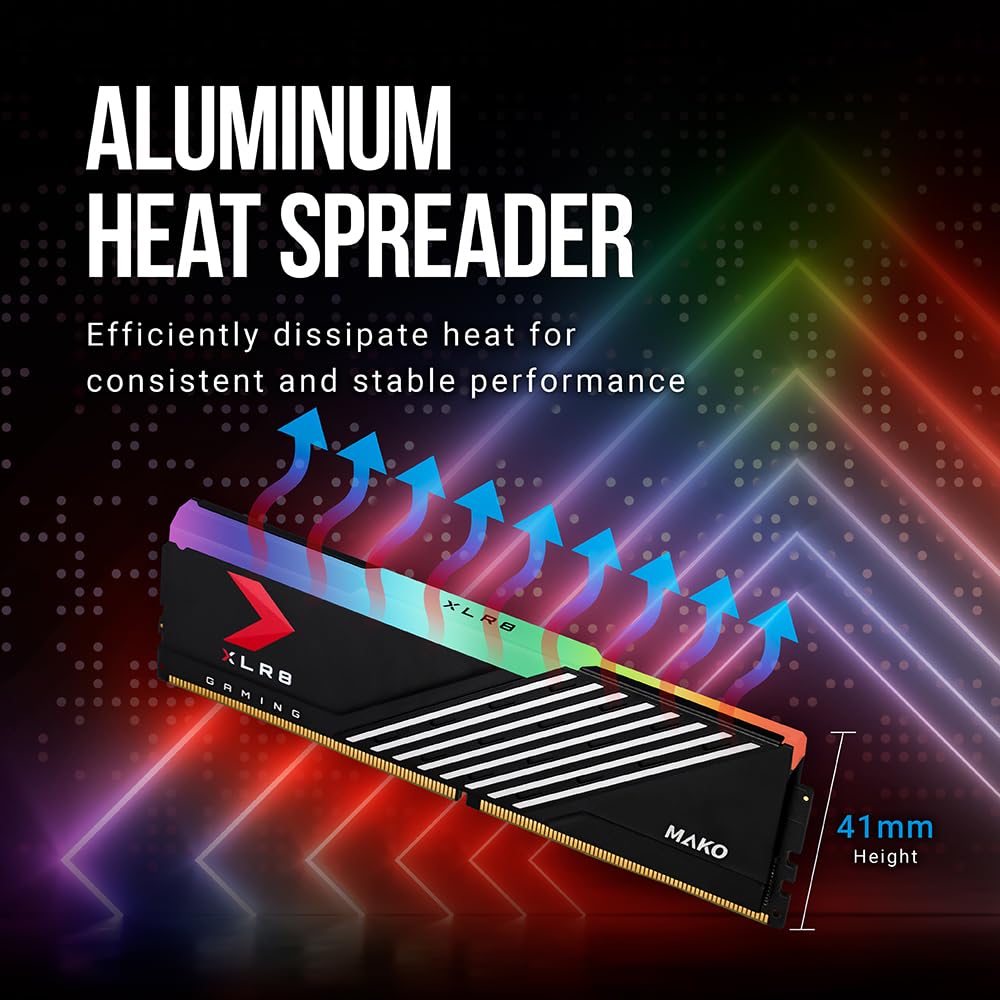 Q: How does the aluminum heat spreader benefit the PNY XLR8 Memory kit?A: The aluminum heat spreader on the PNY XLR8 Memory kit helps dissipate heat generated during high-performance use, ensuring stable operation and longevity while also providing a stylish look with its silver angled relief lines.