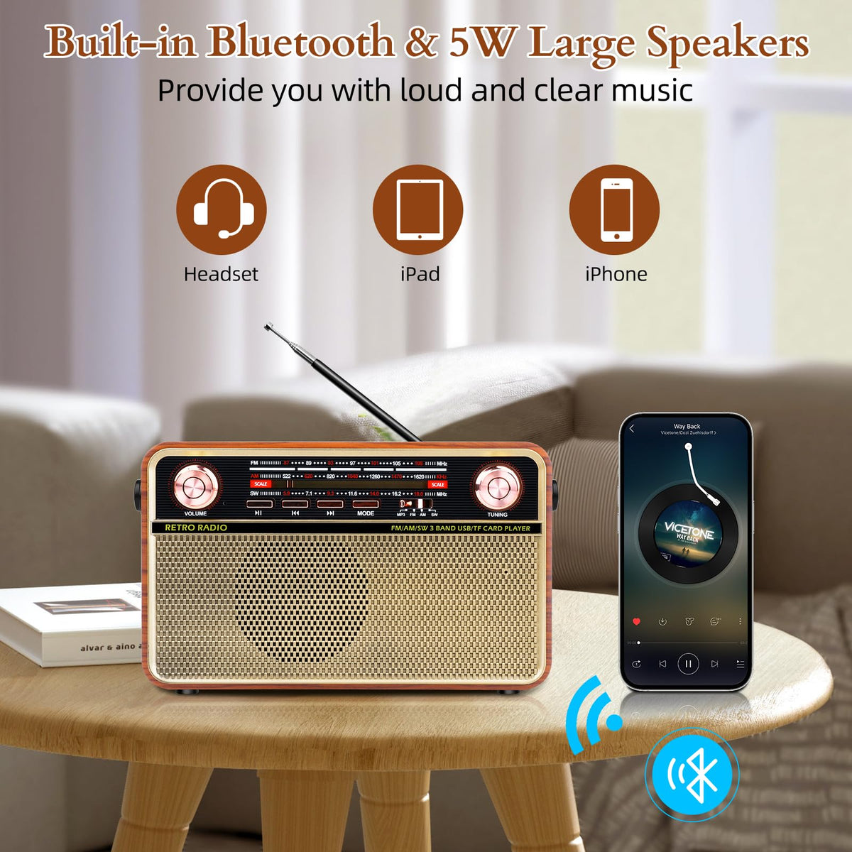 Dmyond Retro Vintage Radio Am Fm, Portable Shortwave Radio With, Ac, Rechargeable Battery Operated Radio