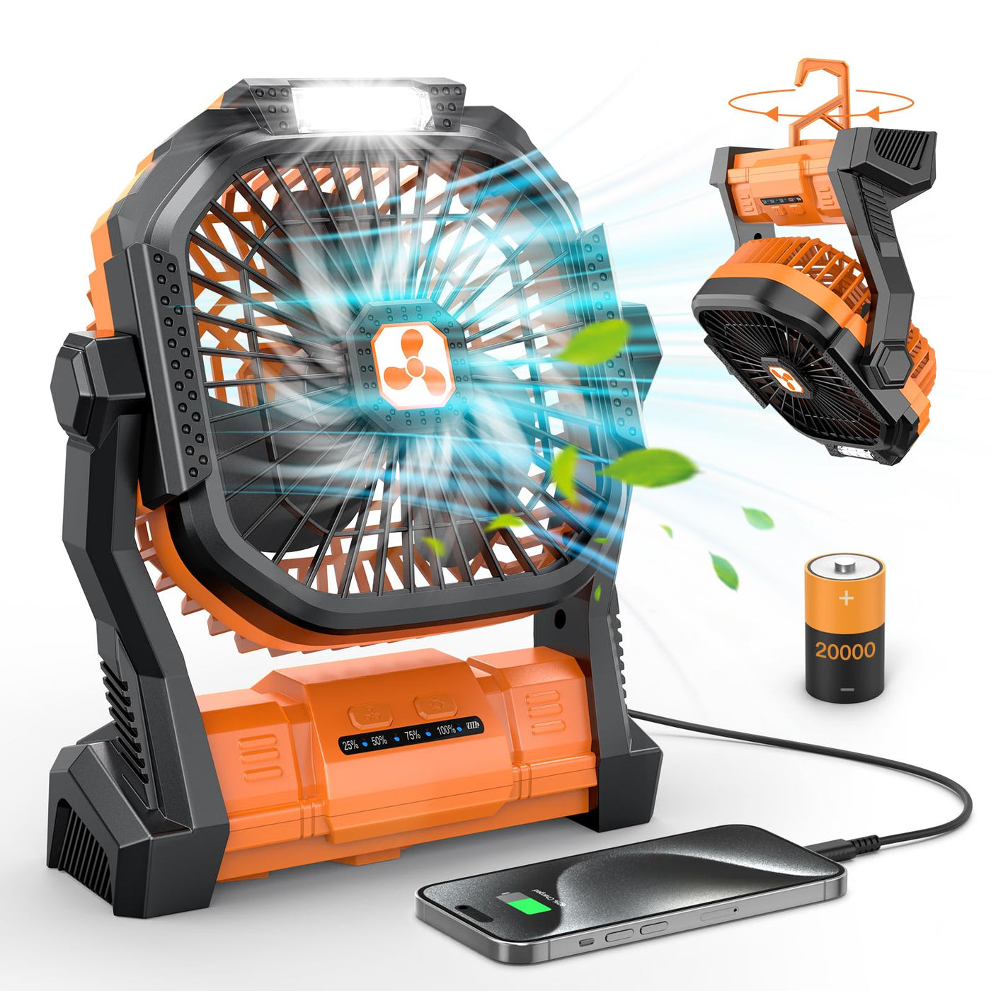 Camping Fan With Led Lantern, 9 Inch Rechargeable Battery Powered Fan With 270Head Rotation, Stepless Speed And Quiet Battery Operated Tent Fan For Picnic, Barbecue, Fishing, Travel, Home. Different From Other Low-Quality Products On The Market, The Camping Fan Built-In A Rechargeable Battery, Which Can Work Continuously For Long Time, Bringing You More Lasting Coolness. In Addition, It Also Supports Working While Charging, And Does Not Generate Heat During Use, Which Is Also Safe For Children. The Camping Tent Fan Adopts Lastest Brushless Motor Technology And High-Performance Ultra-Thin Fan Blades, Which Can Provides You With Ultra-Strong Airflow At The Lowest Noise (