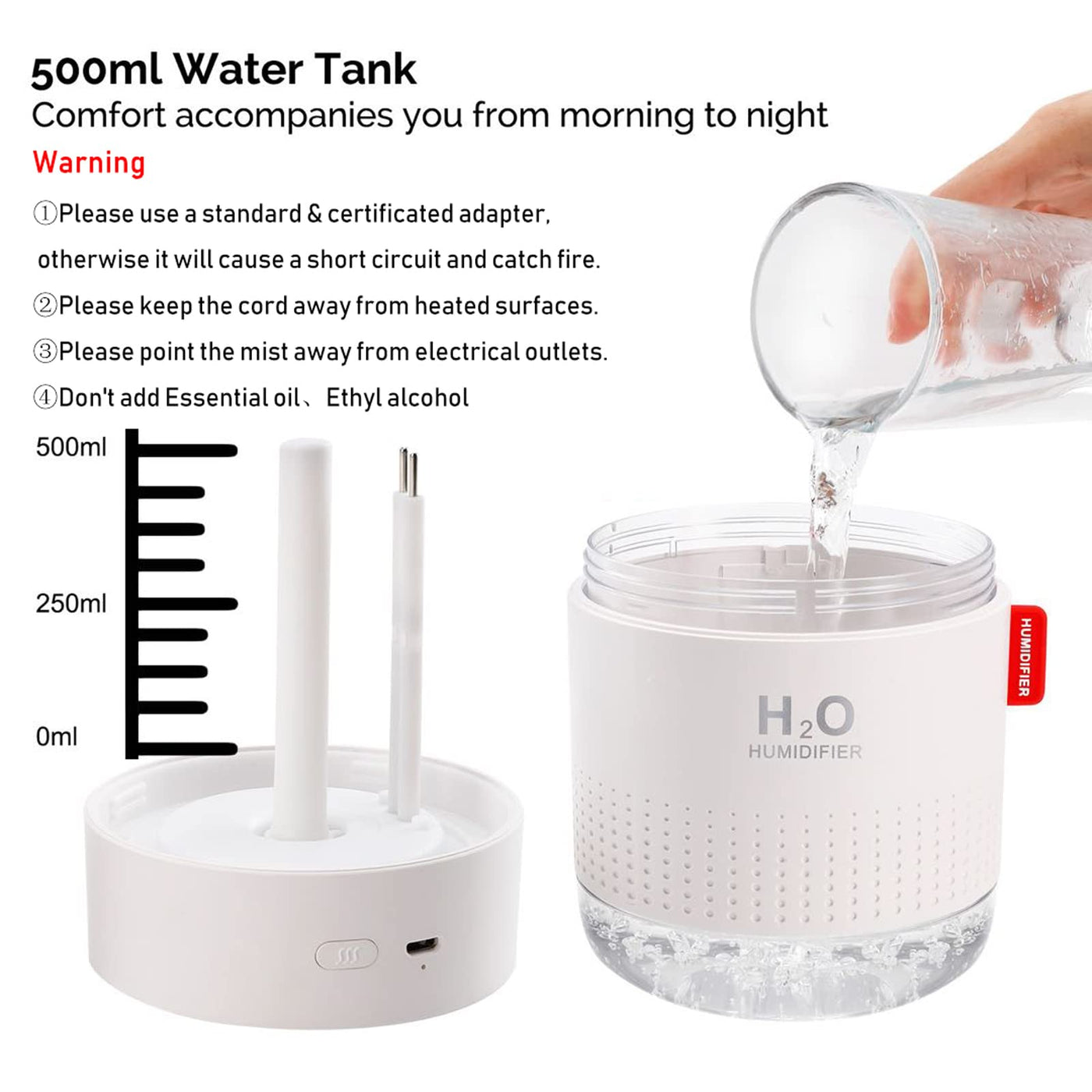 Q: What is the capacity of the Portable Mini Humidifier?A: The Portable Mini Humidifier has a water tank capacity of 500 ml, allowing it to operate for up to 12 hours continuously.