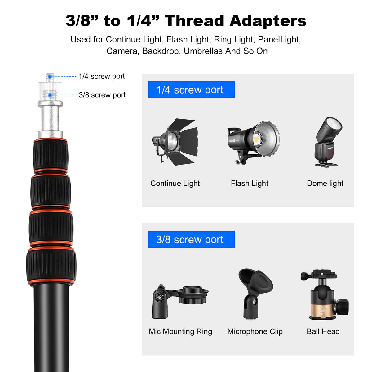 Q: Is the tripod compatible with DSLR and mirrorless cameras?A: Yes, the tripod features a reversible 1/4" to 3/8" screw adapter, making it compatible with a wide range of devices including DSLR and mirrorless cameras, ring lights, LED panel lights, and more.