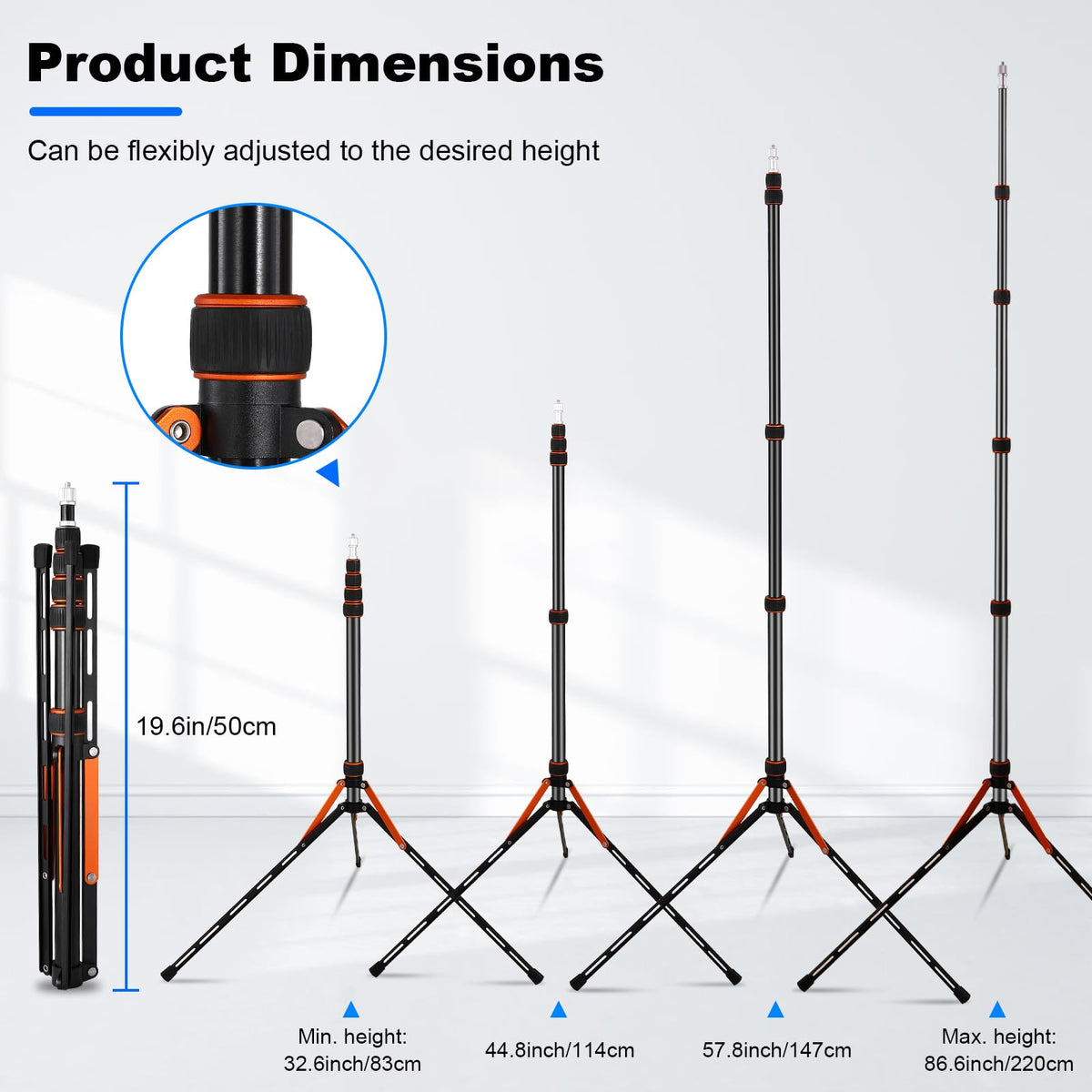 Q: What is the maximum height of the Soopho Portable Photography Light Stand?A: The Soopho Portable Photography Light Stand can be adjusted to a maximum height of 86.5 inches (220 cm), allowing for versatile shooting angles and heights.