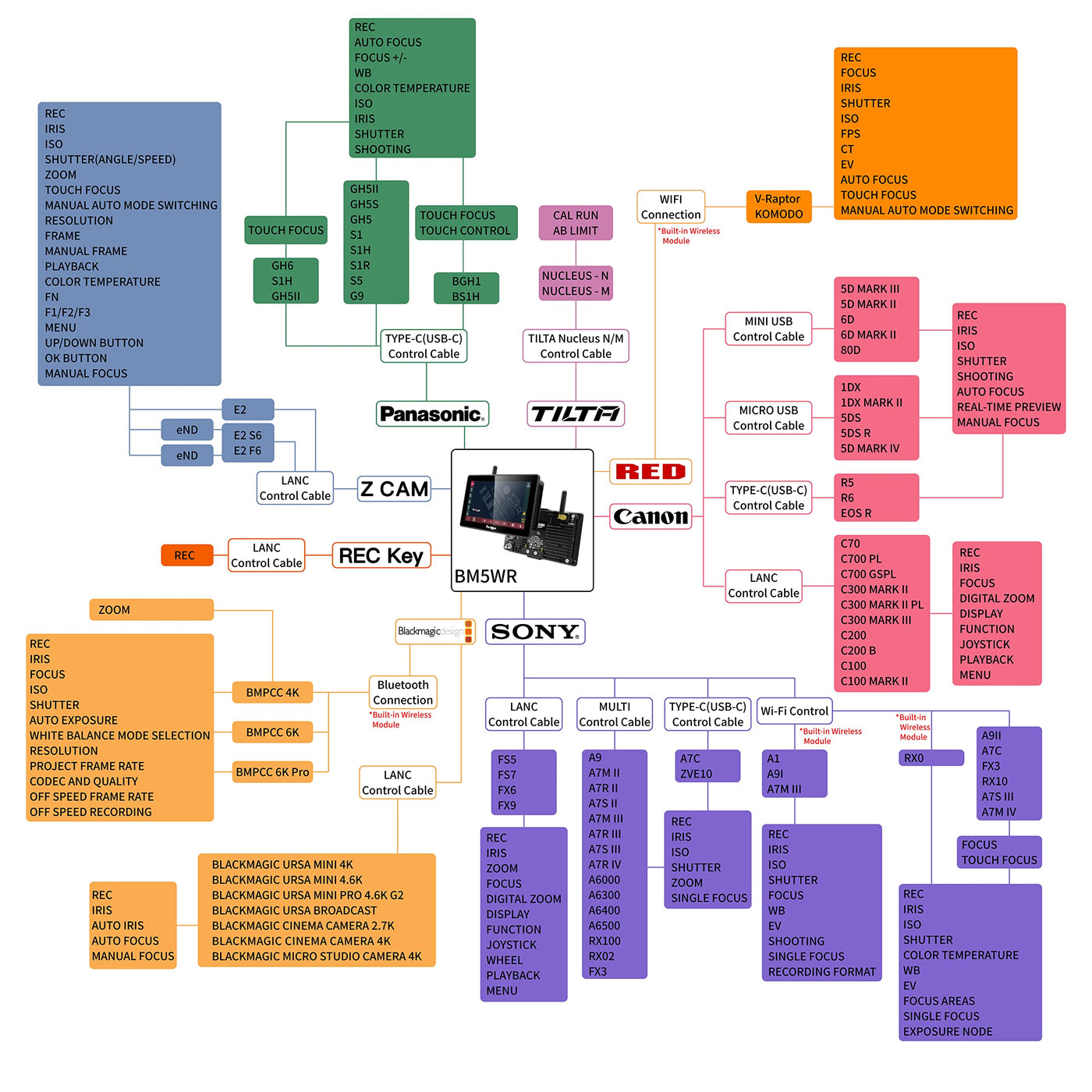 Support Camera Support Wi-Fi Control Red Komodo Bluetooth Control Bmpcc 4K, 6K, 6K Pro Wired Control Compatible With Sony, Canon, Panasonic, Bmd, And Zcam E2. It Also Supports Motor Control Of The Tilta Nucleus N/M. It Allows You To Control The Focus Of Komodo, Bgh1, E2 Via The Touch Screen.&Nbsp; Compatible With Blackmagic: Bmpcc4K, Bmpcc6K, Ursa Mini 4K, Ursa Mini 4.6K, Ursa Mini Pro 4.6K G2, Ursa Broadcast, Cinera Camera 2.7K, Cinera Camera 4K, Micro Studio Camera 4K (Lanc Control Cable) Compatible With Canon: 5D Mark Iii, 5D Mark Ii, 6D, 6D Mark Ii, 80D (Mini Usb Control Cable) 1Dx, 1Dx Mark Ii, 5Ds, 5Ds R, 5D Mark Iv (Micro Usb Control Cable) R5, R6, C70, Eos R [Usb-C Control Cable] C700 Pl, C700 Gspl, C300 Mark 2, C300 Mark 2 Pl, C200, C200B, C100, C100 Mark 2 (Lanc Control Cable) Compatible With Tilta: Nucleus-N, Nucleus-M (Tilta Nucleus-N/M Control Cable) Compatible With Panasonic: Gh5, Gh5S, S1, S1H, S1R, S5, G9, Bgh1[Usb-C Control Cable] Red Komodo Compatible With Sony: A9, A7M Ii, A7R Ii, A7S Ii, A7M Iii, A7R Iii, A7R Iv, A6000, A6300, A6400, A6500, Rx100, Rx02 (Multi Control Cable) Fs5, Fs7, Fx6, Fx9 (Lanc Control Cable) A7S Iii [Usb-C Control Cable] Compatible With Z Cam: E2, E2 S6, E2 F6 (Lanc Control Cable) Packing List: Bm5Wr Monitor *1 Power Cord(Aviation Connector-D-Tap)*1 Power Cord (Aviation Connector-Dc)*1 L-Type Antenna * 2 Warm Prompt Card*1 U-Disk(Contain User Manual)*1 Note: Bm5Wr Does Not Provide A Separate Camera Control Cable, If Your Camera Is Not A Wireless Control Type, Please Separately Purchase A Control Cable Suitable For Your Camera And Search For The Portkeys Control Cables
