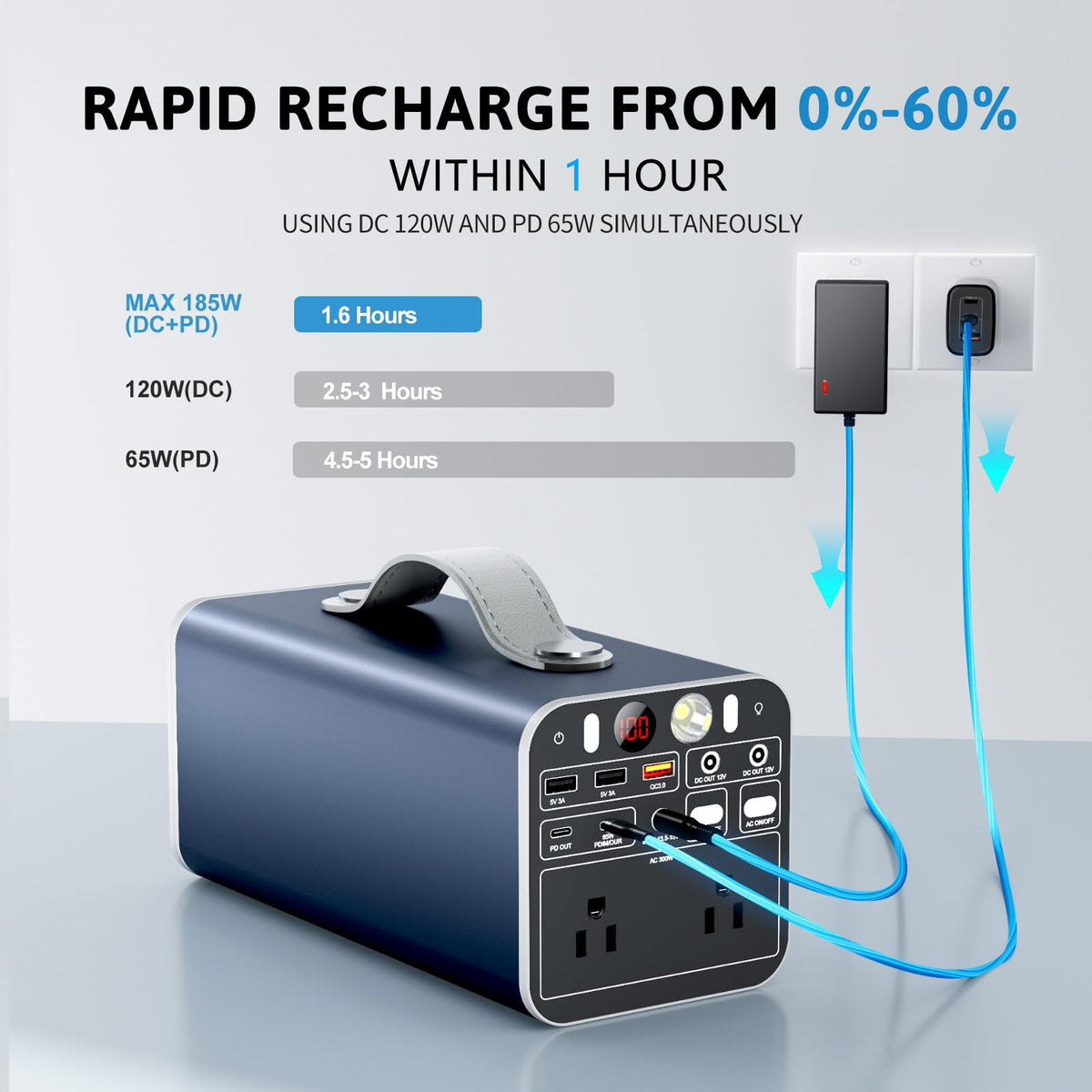 Q: How long does it take to recharge the Powdeom power bank?A: With the DC 120W and PD 65W plugged in, the Powdeom power station can be recharged from 0-60% in just 1 hour, allowing for quick preparation before trips or camping.