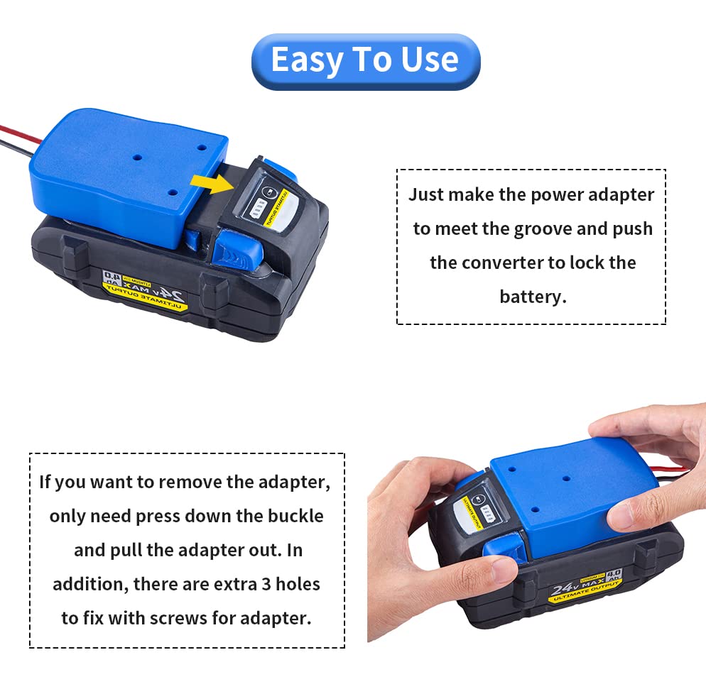 Specifications: 1. Work With For Kobalt 24V Max Kb624-03 Kb524-03 Kb424-03 Kb224-03 Kb124-03 Li-Ion Batteries. Easy To Install ,Locks On You Battery Very Well. 2. The Red Wire Is Connected To The Positive Battery Terminal, And The Black Wire Is Connected To The Negative Battery Terminal. 3. Power Wheels Adapter Has 12.5 Inches Of 14 Gauge Wire Installed. 4. The Wire Terminal Is Convenient For You To Quickly And Accurately Connect The Adapter To The Device. Package List: 1 X 24V Battery Connector 3 X 30A Replacement Fuses 1 X Wire Terminals