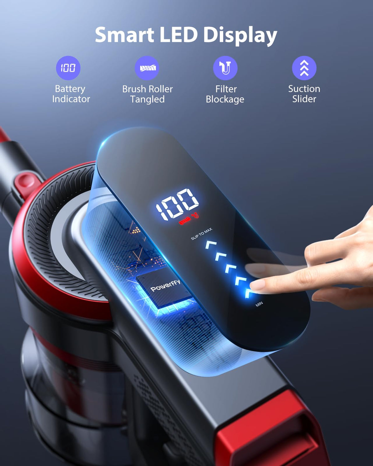 Q: How does the smart touch display work on the Powerffy Cordless Vacuum Cleaner?A: The smart touch display allows users to monitor and adjust the suction power levels in real time. It features a sliding-type stepless adjustment with five levels of suction, catering to different cleaning needs.
