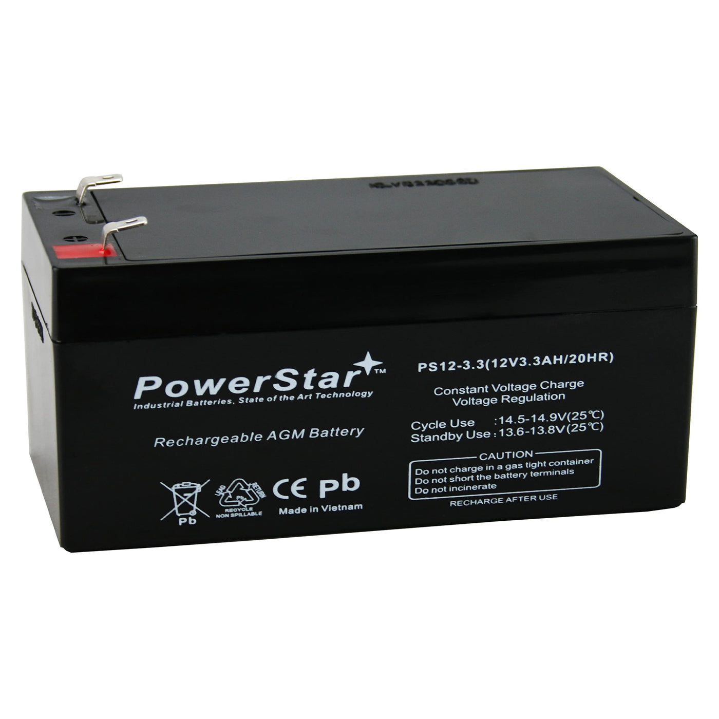 Powerstar 12V 3.3Ah Sla Agm Sealed Lead Acid Battery Powerstar Is An Industry Leader In Agm Batteries.Industry Leading Warranty.Industry Leading Qualityindustry Leading Service If Its Not A Powerstar, Its Just A Batterypowerstar Offers A, 100% Customer Satisfaction, 30 Day Return Policy Powerstar Batteries Are Advanced Agm Technology. (Absorbed Glass Matte)This 12V 3.3Ah Sealed Lead Acid Battery Is Completely Maintenence Free. 100% Sealed And Will Never Leak, Even When Mounted In A Any Postion. You Can Expect A Long Battery Life, Up To 10 Years In Float And Back Up Applications. Our Industry Leading Warranty Is Why You Should Choose Powerstar Brand Sealedlead Acid Batteries. It Is 100% Compatible Fit To Oem Applications Including ..Home Security Alarmsgarage Door Back Up Poweruninterruptable Power Supply(Ups) Electric Power System (Eps)Emergency Backup Power Supplyemergency Lightgenerator Starting Batterylawn Mower Starting Batteryalarm And Security Systemelectronic Apparatus And Equipmentcommunication Power Supplydc Power Supplyauto Control Systemelectric Scooter Length: 5.28 , Width: 2.64 , Height: 2.62 Weight 2.75 Lbs F1 Terminal Replaces Bp3-12 Bp3.6-12 Cf12V2.6 Cfm12V3 Cp1232 And Many More Advanced Agm Technology (Absorbed Glass Matte)Sealed Construction - Will Never Leak - Mount In Any Positionmaintenance Free Shock, Vibration Resistantlow Self Dischargehigh Recoverabilitylow Pressure Ventinghigh Qualiy And Stable Performance