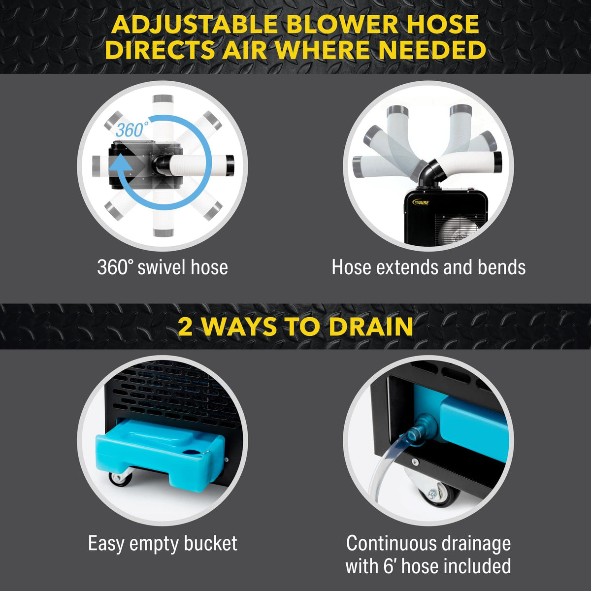Enhance Your Comfort And Productivity: This Portable Spot Cooler Deliversfast And Effective Cooling For Hot Summer Days With The Ability To Operate In Temperatures Up To 109 Degrees Fahrenheit! Ideal For Spaces Such As Garages, Workshops, Farms, Sheds, And Even Construction Sites Making This Portable Air Conditioner The Perfect Partner For Any Project You Are Working On! Use It At Home To Stay Cool And Comfortable When Entertaining Or Grilling Outside-Perfect For Decks, Patios And Porches! | Instant Cooling: The Adjustable Blower Extends And Bends To Direct Air Flow In Any Direction To Quickly Cool Down Your Workspace, Entertainment Area Or Equipment! 360 Degreespinner Wheels Make It Easy To Roll The Spot Cooler Wherever You Need Cool And Refreshing Air. Ideal For Your Garage, Workshop, Shed, Or Patio. Beat The Heat Anywhere. | Continuous Drainage: The Spot Cooler Extracts Excess Moisture In The Air And Includes Two Ways To Conveniently Drain The Water With (1) A 6' Included Hose For Continuous Drainage To A Nearby Drain Or Away From The Cooler Or (2) With An Easy Empty Bucket! Includes An Auto-Shut Off Feature With An Alarm To Notify You When The Bucket Is Full So You Are Free To Finish Up That Project, Start The Grill And Hang Out With Your Friends! No Hassles And No Worries! | Easy Maintanence: Includes A Washable And Reusable Filter So You Never Have To Worry About Purchasing A Replacement Filter And Installing A New One. The Compressor Overload Shut-Off Feature Protects Your Spot Cooler From Over-Heating, Making This Spot Cooler Built To Last! | No Installation Required: No Costly Or Invasive Installation Required, So You Can Save Your Tools And Your Time For Working On Projects. Just Plug In The Spot Cooler And Enjoy The Cool Air Instantly!