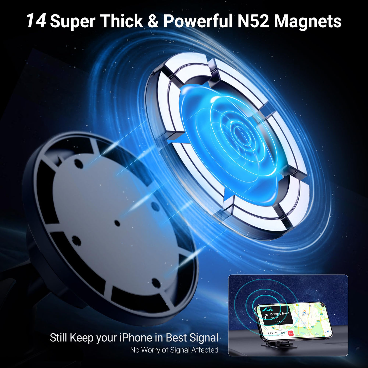 Q: How strong is the magnetic attachment on the PROfezzion Car Mount?A: The PROfezzion Car Mount features 14 powerful rare-earth magnets that securely hold your phone in place. This strong magnetic attachment ensures that your phone remains stable and secure even during bumps, sharp turns, or sudden stops.