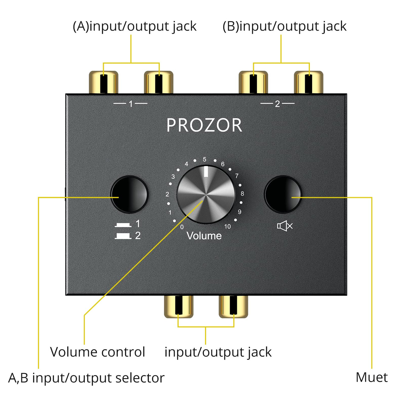 Prozor Rca Stereo Audio Switcher 2 In 1 Out R/L Stereo Audio Switch, 1 In 2 Out Stereo Audio Splitter With Mute Button And No External Power Required