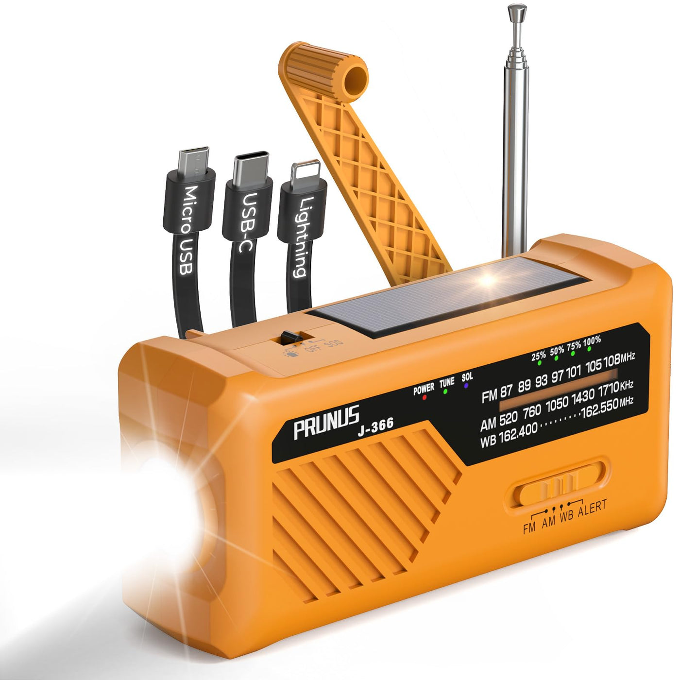 Prunus J-366 Emergency Radio- Noaa Weather Alert, 3-In-1 Charging Cables, 5-Way Power(7400Mwh/Aaa Battery/Hand Crank/Solar/Usb-C