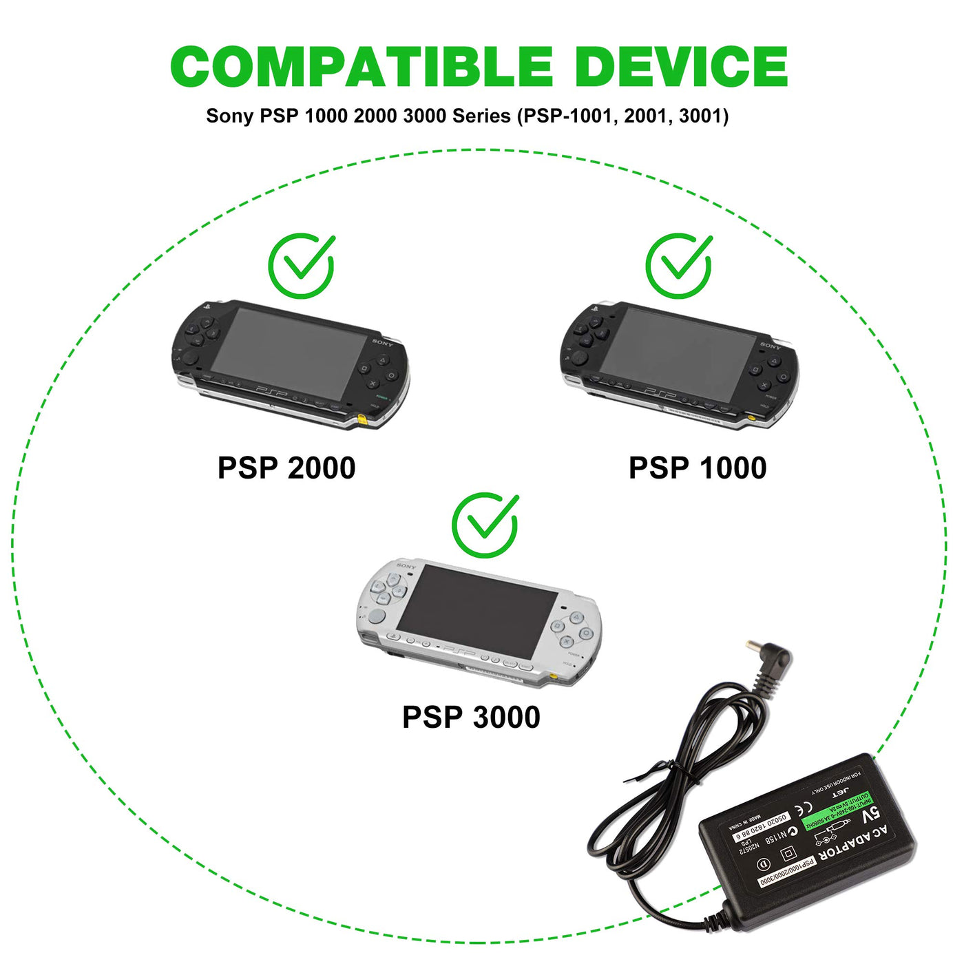 ?Power Specification?: Input: Ac 100-240V 50/60Hz; Output: Dc 5V 2A | ?Product Compatible?:Only Compatible With Sony Psp-1000, Psp-1001, Psp-2000, Psp-2001, Psp-3000, And Psp-3001 | ?Smart Charging?:Intelligent Ic Chip Inside Recognizes A Fully Charged Battery And Automatically Switches To A Saver. | ?Perfect Design?:Collapsible Plug On The Back Of Wall Charger,Small And Lightweight Accessory For Easy Travel And Storage. | ?After Sales Support?:Our Product 100% Extremely Strictly Before Selling, You Can Give It As A Gift To Your Family, Friends, Classmates And Anyone, Especially Your Children.If You Have Any Issues For This Product, Please Contact Us By Amazon Message, We Will Provide You Satisfied Solution At First Time..Content:Ac Adapter (1), Ac Power Cord (1).