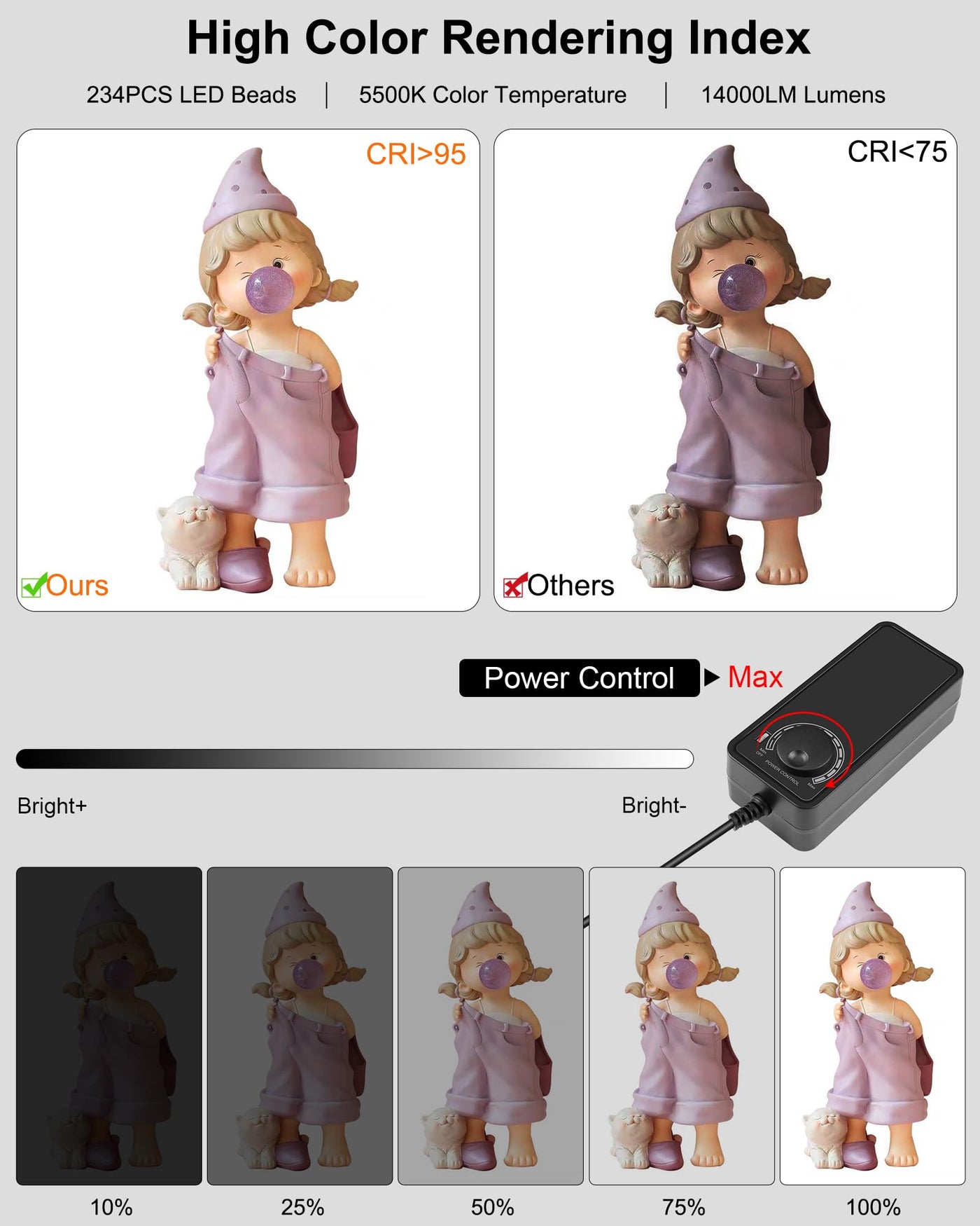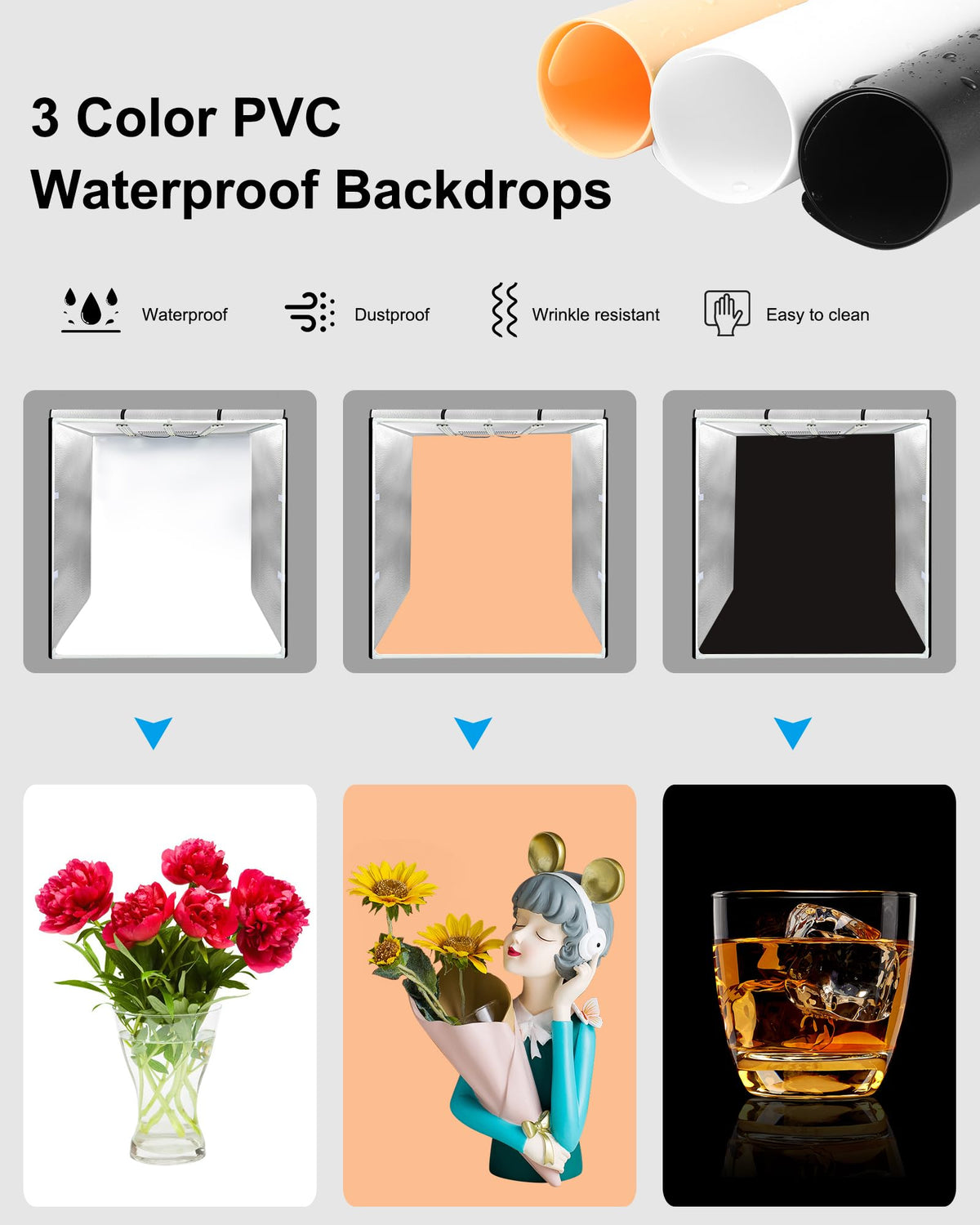 Features1. The Shed Body Is Made Of High-Quality 600D Oxford Cloth, Which Is Anti-Wrinkle, Anti-Shrinkage, Strong Abrasion Resistance And Long Service Life; Aluminum Film Stone Pattern Reflective Cloth Inner Layer, Provide Uniform Lighting And Eliminate Shadows And Glare; 2. The Frame Is Made Of 12 Fiberglass Support Rods, Which Is Strong And Durable; 3. Large Enough Space, Suitable For Shooting Objects Smaller Than 65 X 65 X 65Cm, Such As Bags, Kids Clothing, Green Plants, Etc.; 4. High-Quality Lamp Panels, High-Quality Led Lamp Beads, High Brightness, Low Energy Consumption, No Flicker, Color Rendering Index Greater Than Or Equal To 95, Can Well Restore The Color Of The Item Itself; 5. The Power Of The Three Led Light Panels Can Reach 90W, And The Brightness Can Be Infinitely Dimmed, Which Can Provide Sufficient Supplementary Light Brightness For Shooting; The Light Panels Can Be Moved And Can Be Used For Lighting As Needed, Making It Easy To Shoot Commercial Blockbusters With A Strong Three-Dimensional Effect; 6. Various Shooting Windows And Angles: Top Window Overlooking Shooting, Front Full-Open Shooting, Front Half-Small Window Shooting, Front Small Window Shooting; 7. Three Pvc Background Boards, You Can Choose The Background According To Your Needs. The Background Board Is Anti-Wrinkle, Waterproof And Easy To Clean; 8. Easy To Install And Disassemble, Equipped With A Carrying Bag, Can Be Carried Anywhere.Specificationsmain Material: 1. Shed Body: 600D Oxford Cloth + Aluminum Film Stone Pattern Reflective Cloth 2. Bracket: Fiberglass Tube Adapter Power Supply: 1. Input: 100-250V 47-63 Hz 2. Output: 18V 1.66A X 3 3. Output Current: 5A Led Light Panel: 1. Number Of Lamp Beads: 234Pcs (78Pcsx3) 2. Lumens: 14000Lm 3. Color Temperature: 5500K 4. High Cri (Hcri): Greater Than Or Equal To 95Package List1. Main Studio Box X 1 2. Black Backdrops X 1 3. White Backdrops X 1 4. Orange Backdrops X 1 5. Soft Cloth X 1 6. Power Supply X 1 7. Light Board X 3 8. Three-Way Connectors X 8 9. Support Bars X 12 10. Manual X 1 11. Package Bag X 1