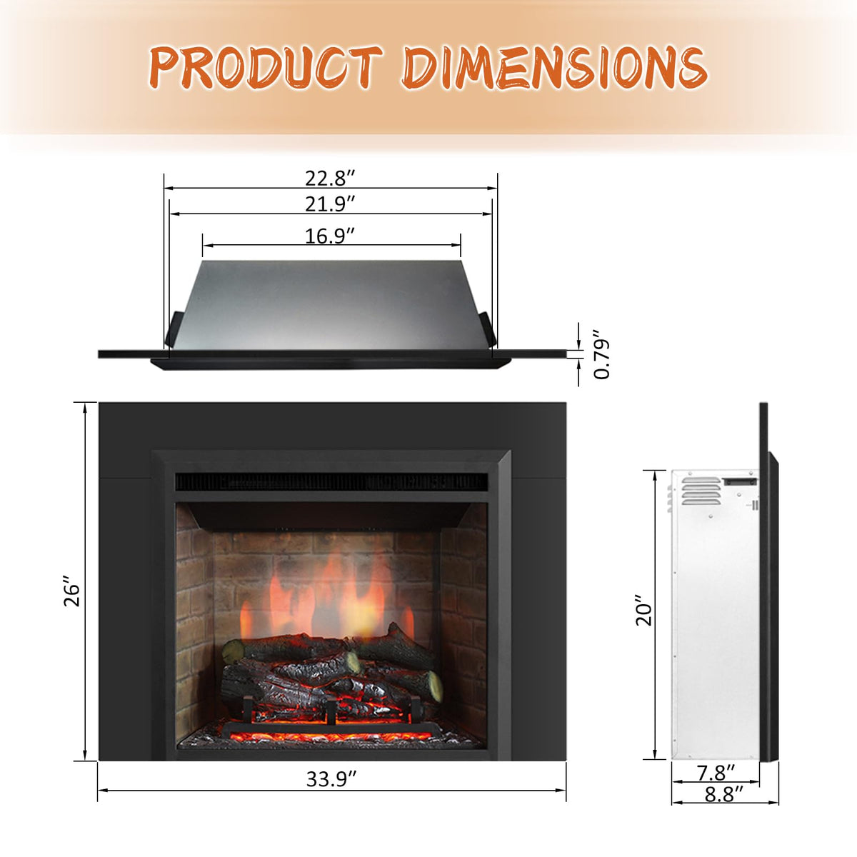 Overall Dimensions: Width: 33.9'' Wide X 26'' High X 8.8'' Deep. Come In 2 Packages And May Be Delivered On Different Days. | 3 Flame Settings With Variable Intensity And Brightness Can Be Used With Or Without Heat All Year Long; 100% Energy Saving Led Technology. A Sleek Look With Three-Sided Interior Brick Wall And Clean Glass Front Trim Design, Without The Hassle Of Cleaning Dust Or Ashes. | Life-Like Resin Log Which Is 7 3/32'' High Sitting On The Grate Above Ember Bed, That'S Just What A Wood Burning Fireplace Looks Like. | Adjustable Thermostat; A Supplemental Heat For Up To 400 Sq. Ft. Cannot Be Used As A Main Heat Source; Remote Control Provided For Easy Operation. | Easy To Install And Uninstall. With Flat Bottom, The Insert Can Just Sit On The Floor Directly; Plug In And Use Under A Voltage Of 120, Cannot Be Hard Wired. One Year Warranty But Customer Service Is Always Ready For Help Whenever You Need.