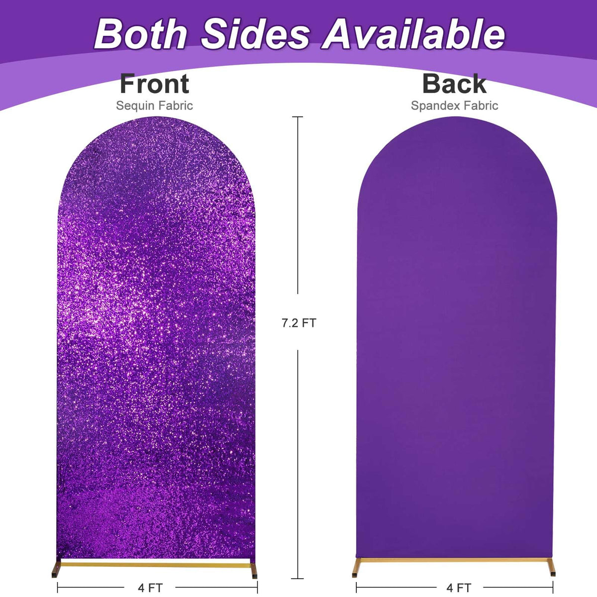 Q: What are the dimensions of the Purple Sequin Arch Cover?A: The Purple Sequin Arch Cover measures 4 feet in width and 7.2 feet in height, making it suitable for standard round-top arch frames.