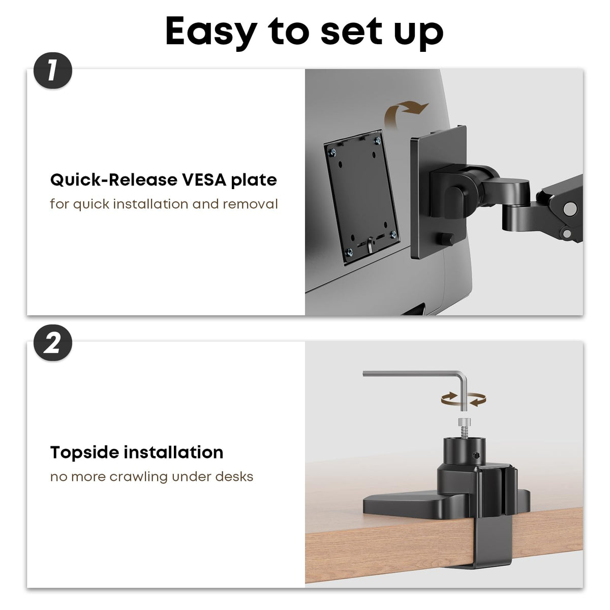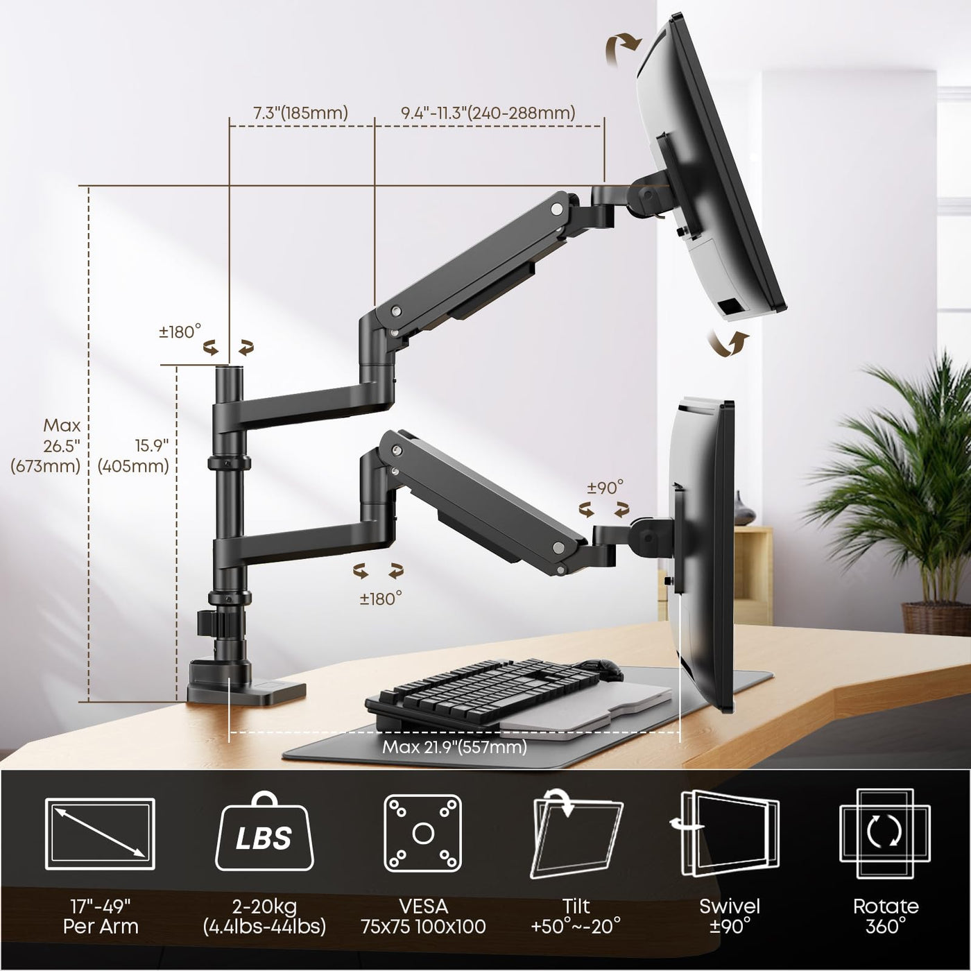 Product: Heavy duty Dual monitor arm Material: Aluminum and steel Fit screen size: 17 inch - 49 inch monitors for stack type ; 17 inch - 35 inch monitors for non-stack type VESA holes: 75 x 75 mm and 100 x 100 mm Weight capacity: 4.4 lbs to 44 lbs (2 kg - 20 kg) per arm Screen rotation: +180� to -180� Screen tilt: +50� to -20� (up and down) Swivel: +90� to -90� (left and right) Desk installation options: Clamp for 0.47 inch to 2 inch; Grommet for 0.47 inch to 2 inch Cable management: Built-in Cable Management cover Hardware kit: Monitor mounting screws included Where to use: Home office and any places that with suitable desk