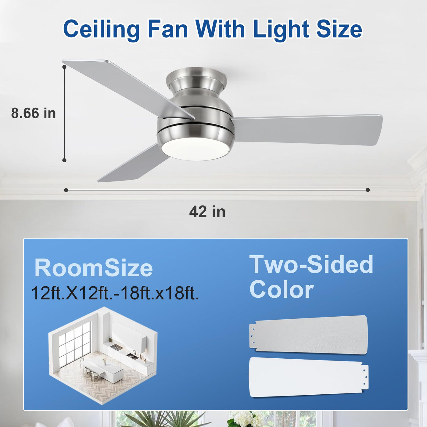 42 Inch Ceiling Fans With Lights, Brushed Nickel Low Profile Ceiling Fan With Light And Remote Control, Flush Mount, Reversible, 6 Speeds, 3Cct, Dimmable, Modern Ceiling Fan For Bedroom, Indoor/Outdoor