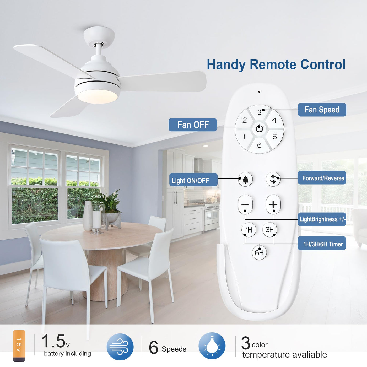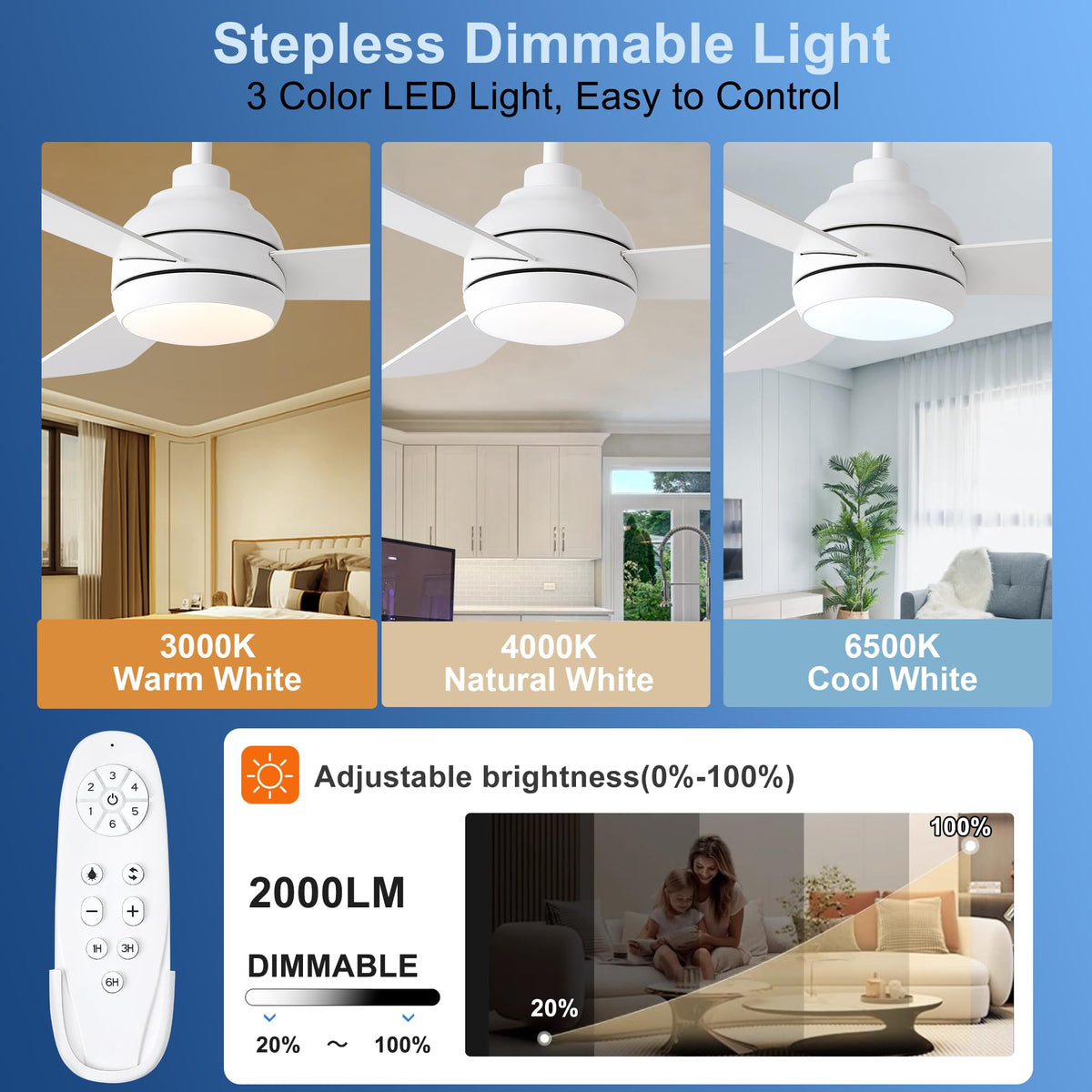 Putroad 42 Inch Ceiling Fans With Lights And Remote, Modern White Ceiling Fan With Light, Dc Reversible, 6 Speeds, 3Cct, Dimmabl