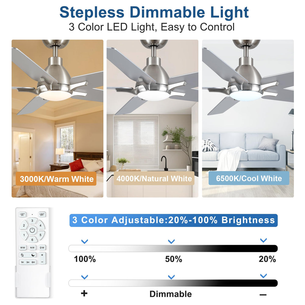 Q: What are the key features of the putroad 52 Inch Ceiling Fan?A: The putroad 52 Inch Ceiling Fan features a brushed nickel design, a reversible DC motor with 6 speeds, 5 blades, and a dimmable LED light that offers three color temperatures (3000K warm white, 4000K natural white, and 6500K cool white). It also includes a remote control for easy operation and has a timer function for sleep shutdown.