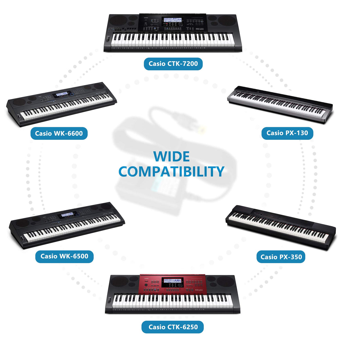 Pwron Is Specializing In The Production And Economical Replacement Power Supply For Laptop,Tablet,Phones And Other Electrical Appliances. Products Manufactured With The Materials And Include Multiple Smart Features Safeguarding Against Iv - Incorrect Voltage, Sc - Short Circuit, Io - Internal Overheating . Chargers Are Certificated With Ce Fcc Etc. Power Adapter: Input: Ac 100-240V, 50-60Hz Output: 12V 2A Polarity: Positive (+) Center Length: 6.6Ft Long Cable Overload Protection With Wires Overheating Protection With Smart Chip Anti-Interference Feature With Better Isolation Materials Tested With Strict Quality Control Standards Please Note That This Power Adapter Is Compatible With The Listed Models Of Casio Keyboard Only, And Check The Model Of Your Piano Keyboard Before Purchasing. Compatible Models: Casio Ctk Series: Ctk-6000 / Ctk-6250 / Ctk-6300 / Ctk-6320 / Ctk-7000 / Ctk-7200 / Ctk-7300 / Ctk-7320 Casio Wk Series: Wk-6500 / Wk-6600 / Wk-7500 / Wk-7600 Casio Px Series:Px-130 / Px-135 / Px-150 / Px-160 / Px-330 / Px-350 / Px-358 / Px-735 / Px-750 / Px-760 / Px-A100Rd / Px-3S / Ps-5S / Px-5Spro / Px-7We Casio Keyboard:Ap-220 / Ap-250 / Ap-260 / Ap-220Bk / Ap-250Bk / Cdp-120 / Cdp-130 / Cdp-135 / Cdp-220 / Cdp-230 / At-3 / At-5D P/N: Ada12150Lw / Ad-A1215Lw Warm Tip Please Note That Only The Models Listed In The Following Model List Will Be Matched. Other Models Are Not Guaranteed To Be Applicable. Please Check Your Keyboard Model Before Buying. Please Note That Only The Models Listed In The Following Model List Will Be Matched. Other Models Are Not Guaranteed To Be Applicable. Please Check Your Keyboard Model Before Buying.