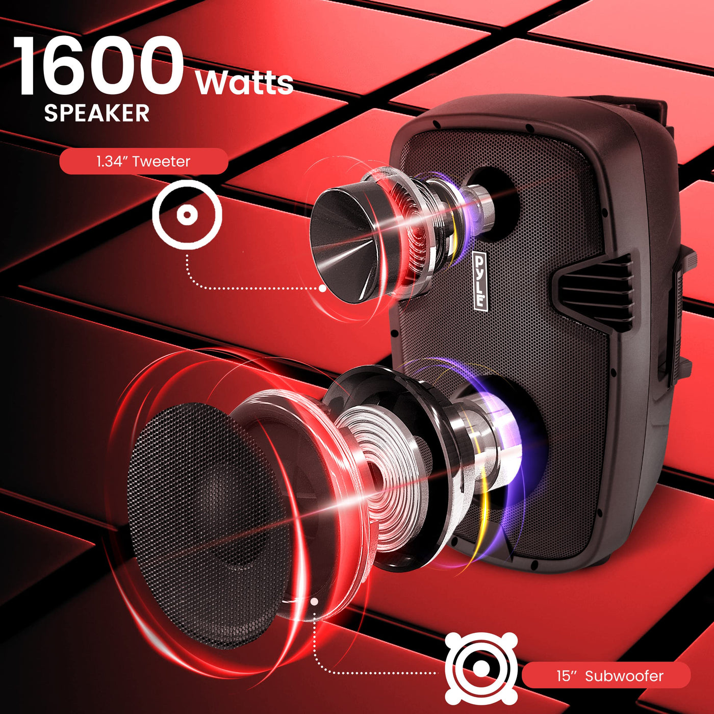 Pyle 1600 Watt, 15'' Bluetooth Pa Speaker Indoor/Outdoor Portable Sound System With (2) Uhf Wireless Microphones Rechargeable Ba