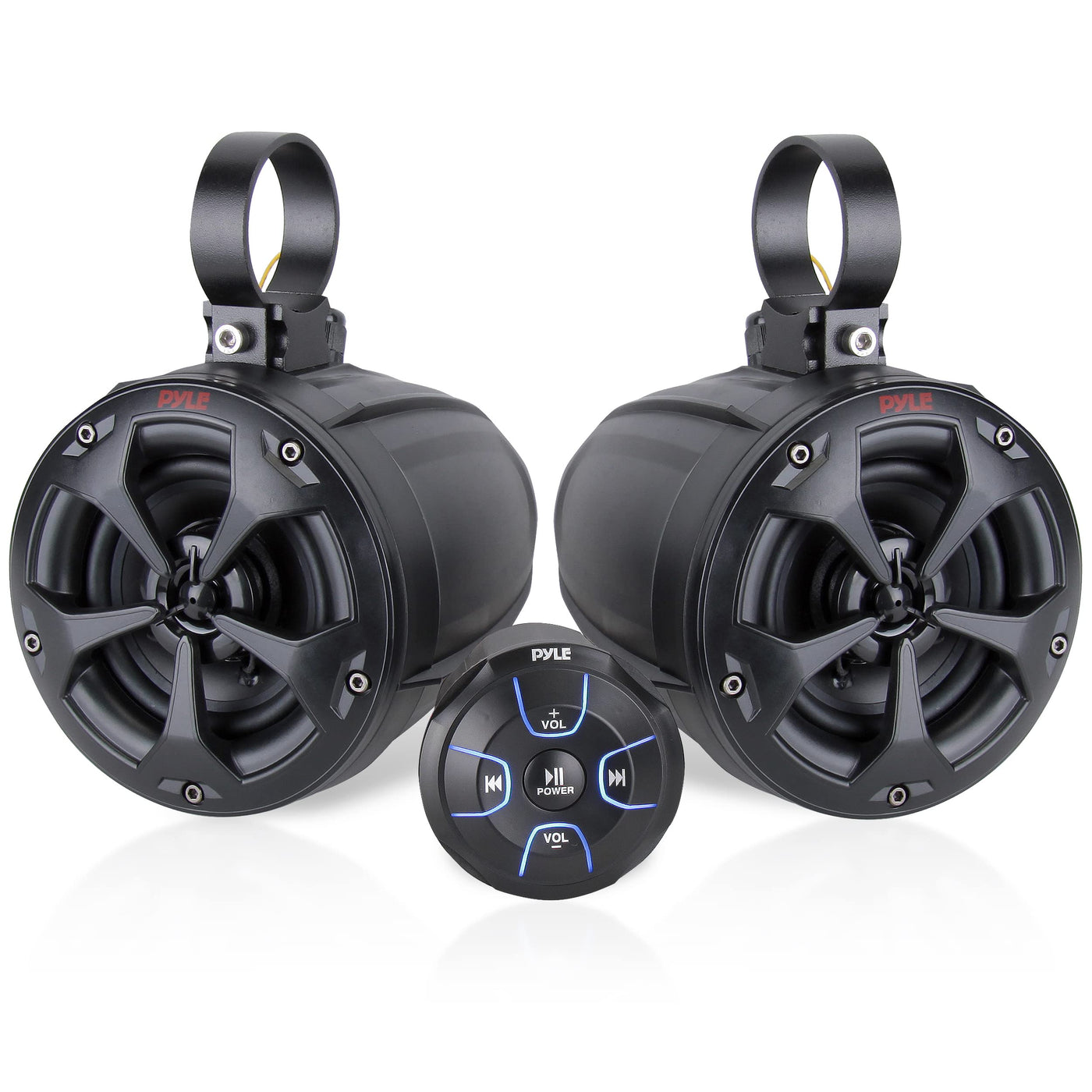 The Pyle 4 Waterproof Rated Off-Road Speakers With Amplified Bluetooth Remote Control Receiver - Compact Dual Vehicle Speaker System For Atv, Utv, 4X4, Jeep, Powersports Vehicles - Waterproof Rated Speakers + Bluetooth Controller System Kit - Universal Mount System For Convenient Audio Control - Bluetooth Wireless Music Streaming Ability - Waterproof-Rated Marine Grade Construction - Weatherproof & Water-Resistant Design - Compact & High-Powered System Output - Used For Car, Truck, Atv, Utv, 4X4, Boat, Marine Watercraft, Powersport Vehicles - Whats In The Box: - (2) 4 -Inch Marine Speakers - Amplified Bluetooth Control Unit - Installation / Mounting Kit - Speaker Connection Wire - Bluetooth Control Unit: - Built-In Bluetooth Audio Receiver - 2-Channel Amplifier Style - Works With All Of Todays Latest Devices - Smartphones, Tablets, Laptops, Computers, Etc. Features: Waterproof Rated Speakers + Wireless Bt Controller System Kit Universal Mount System For Convenient Audio Control Wireless Bt Music Streaming Ability Marine Grade Construction Water-Resistant, Weatherproof Design Compact & High-Powered System Output Used For Cars, Trucks, Atvs, Utvs, 4X4S, Boats, Marine Watercrafts, & Powersport Vehicleswhats In The Box: (2) 4 -Inch Marine Speakers Amplified Wireless Bt Streaming Control Unit (2) 2 Meters Speaker Wire Audio Connection Cable, 3.5Mm (2) 5.91 X 0.75 X 0.24 -Inches Rubber Pads (2) 6.5 X 0.75 X 0.08 -Inches Rubber Pads (4) Butt Connector (Red Color For A.W.G 16-22)Wireless Bt Control Unit: Built-In Wireless Bt Audio Receiver 2-Channel Amplifier Style Works With All Of Todays Latest Devices Smartphones, Tablets, Laptops, Computers, Etc. Connect & Stream Audio From Additional External Devices Aux (3.5Mm) Input Full Range Stereo Sound Reproduction Integrated Power Wiring Harness Pre-Amp Rca Out To Any Oem/Factory-Made Mono-Block/Full-Range Amplifier Flush Mount Mounting Kits Included Universal Vehicle Mounting Can Be In-Console Flush Mounted Anti-Thump Turn-On Soft Turn On/Off Option Overload & Power Protection Circuitrywireless Bt Control Unit Technical Specs: Power Output: 800 Watt Max 2X200 Watts Rms @ 4 Ohm 2X400 Watts Max @ 4 Ohm Wireless Bt Version: 5.0 Wireless Bt Network Name: Pyleusa Wireless Range: 30+ Ft. Amplifier Type: Class D Marine Grade Ip65 Rating T.H.D: 0.1% S/N Ratio: > 95 Db Channel Separation: > 65 Db Frequency Response: 10 - 40 Khz Fuse: 10A Power: Dc 12V Unit Dimensions (Diameter X Depth): 3.8 X 4.17 - Inchesmarine Speakers: Pro Audio Powersport Speakers Sound System: (2) X 4 Woofers + (2) X 0.5 Tweeters 2-Way Full Range Stereo Sound Reproduction Quick-Connect Spring-Loaded Speaker Terminals Impressive Bass Response Sleek Design, Machine Molded Speaker Cabinet Housing Rugged, Universal Mount Bracket Design For Roll-Bar/Roll-Cagemarine Technical Specs: Power Output: 800 Watt Max Marine Grade Waterproof Rating: Ip-X5 Speaker Style: Passive Speakers Speaker Type: Polypropylene Cone, Butyl Rubber Surround (X2) Tweeter Type: Neodymium Dome (X2) Frequency Response: 85Hz-20Khz Impedance: 4 Ohm Magnet Type: 20 Oz. Circuit Mid-Woofer Voice Coil Type: 1.0, Aluminum Sensitivity: 90 Db +/- 2 Db @ 1M/1W Universal Mounting Brackets Roll-Bar/Roll-Cage Diameter: 1.25 ~ 2.0 -Inches Power Supply: Dc 12V Speaker Size (Front Diameter X Length): 5.6 X 7.3 -Inches (Each)