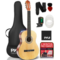 Pyle Model : Pgacls82 Classic Style 34 Scale Guitar6-String Classic Guitar - 34 Size Scale 36Aa Guitar With Digital Tuner & Accessory Kit Features:34 Scale Size Guitar Traditional Classic Body Style Hand-Crafted Wooden Construction Protective Binding High-Gloss Polished Body & Back Machine Head: Chrome 3-In-Line Dyed Wood Design, Rosette Linden Laminate Finish Starter Guitar Design Perfect For Beginners & Children Whats In The Box: Guitar Picks Digital Guitar Tuner Spare Guitar Strings Travel Storage Guitar Gig Bag Detachable Guitar Shoulder Strap Cleaning Cloth Digital Guitar Tuner: Convenient Clip-On Design Tuning Range: A0 - C8 (275 - 4186 Hz)Response Time: Used For Stringed Instruments: Guitars, Bass, Violins, Ukuleles Battery Powered Tuner: Requires (1) X Button Cell (Cr-2032), Included Tuner Size: 24Aa X 10Aa X 20Aa -Inches Technical Specs: Total Guitar Length: 36Aa Inches Scale Length:228Aa-Inches (580Mm)Total Body Length: 173Aa-Inches (440Mm)Total Neck Length (Nut To Body): 185Aa -Inches (470Mm)Headstock Material: Birch Wood Fretboardfingerboard Material: Dyed Hardwood Number Of Frets:18 Frets Guitar Body Material: Linden Woodguitar String Material: Nylon Total Guitar Dimensions (L X W X H): 358Aa X134Aa X34Aa-Inches