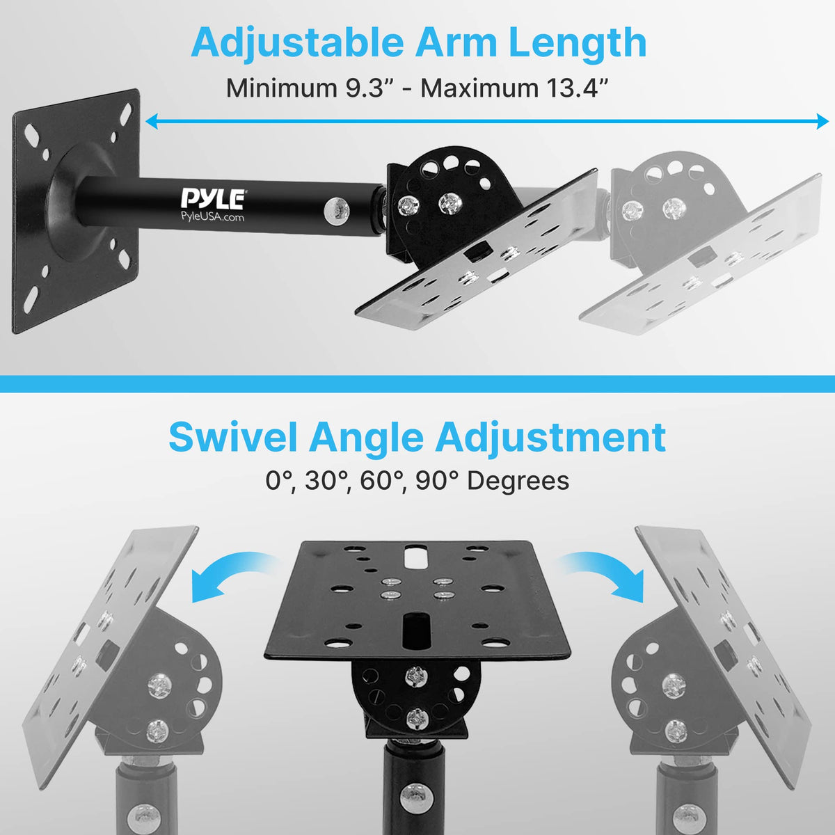 Pyle Model : Pstndc31Dual Wall / Ceiling Speaker Mountsdual Wall / Ceiling Speaker Mounts, Universal Mounting Holder Stands For Speakers, Swivel Adjustablefeatures: Includes (2) Universal Speaker Bracket Wall Mounts Safely Mount Or Hang Speakers On Any Flat Surface Durable, Rugged & Reliable Convenient Length & Swivel Adjustment Speaker Arm Length Extension Adjustable Secure Locking Screws For Speaker Stability Heavy Duty Reinforced Solid Formed Steel Construction Perfect For Home, Office Or Studio Usetechnical Specs: Minimum Distance Arm Extends From Wall: 3.9'' Maximum Distance Arm Extends From Wall: 11.0'' Swivel Angle Adjustment: 0, 30, 60, 90 Degrees Max. Speaker Weight Capacity: 75 Lbs. Dimensions (L X W X H): 6.9'' X 5.3'' X 11.0''Pyle Dual Wall / Ceiling Speaker Mounts, Universal Mounting Holder Stands For Speakers, Swivel Adjustable (Pair) - Includes (2) Universal Speaker Bracket Wall Mounts - Safely Mount Or Hang Speakers On Any Flat Surface - Durable, Rugged & Reliable - Convenient Length & Swivel Adjustment - Speaker Arm Length Extension Adjustable - Secure Locking Screws For Speaker Stability - Heavy Duty Reinforced Solid Formed Steel Construction - Perfect For Home, Office Or Studio Use - Minimum Distance Arm Extends From Wall: 3.9'' - Maximum Distance Arm Extends From Wall: 11.0'' - Swivel Angle Adjustment: 0, 30, 60, 90 Degrees - Max. Speaker Weight Capacity: 75 Lbs. - Dimensions (L X W X H): 6.9'' X 5.3'' X 11.0'' - Weight: 8.38 Lbs. (Both Units) - Pyle Model: Pstndc31.