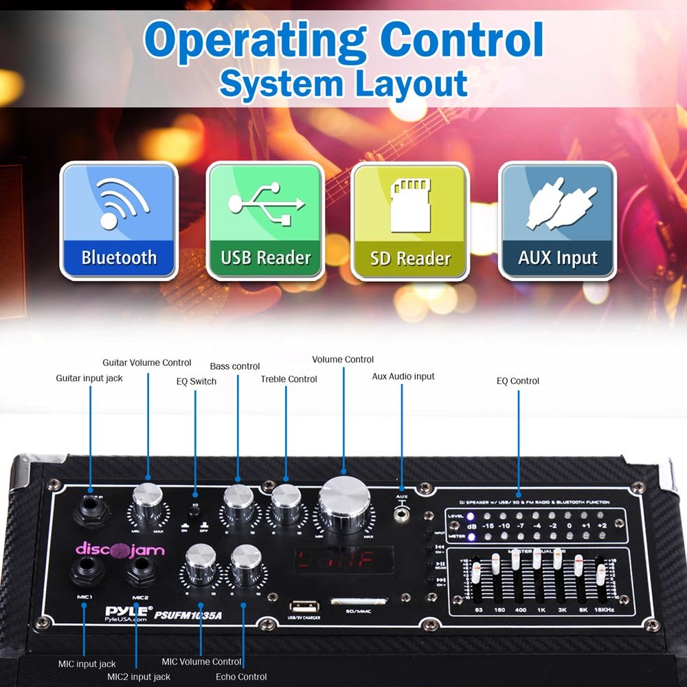 Psufm1035A - Disco Jam Speaker System View Larger Disco Jam Speakers Get The Party Started With Pyles Disco Jam Speakers. Play Your Favorite Tracks As Loud As You Want And With Style. Disco Jam Speakers Feature Impressive High-Power Output And Dj Lights That Will Add Life To Any Occasion. Bluetooth Play Your Favorite Audio Tracks Or Internet Radio Services Like Pandora Or Spotify Wirelessly - Thanks To The Built-In Bluetooth Technology. Instantly Stream Music From Your Iphone, Android, Mp3 Player, Tablet, Pc, Etc. Flashing Dj Lights Built-In Lights Dazzle And Take The Party To The Next Level. Youll Feel Like An Actual Dj In The Club When Your Music Plays And The Lights Flash. The Speakers Feature An On/Off Switch To Control Multi-Color Racing Lights While Your Music Plays. Active & Passive Select Disco Jam Systems Feature Cross Compatibility That Allow You To Use The Speakers Individually Or Connect Them To Your Current Audio Setup Adding An Active Or Passive Speaker. The Psufm1035A Is An Active Speaker And Compatible With Other Passive Speakers But Pairs Particularly Well With The Psufm1030P (Sold Separately). Disco Jam Get Ready To Jam When You Combine Audio Playback With Visual Presentation. Karaoke - Disco Jam Style Disco Jam Speakers Make For The Perfect Karaoke Parties And Performances. Combine Active And Passive Models To A Microphone Input To Create An Awesome Sounding, And Looking, Party. Unit Comes With (2) 1/4'' Microphone Inputs. Speaker Stand Mountable All Disco Jam Models Come Equipped With 35Mm Speaker Stand Mounts On The Bottom Of The Unit. Sound And Style The Psufm1035A Comes With Two 10-Inch Subwoofers And Two 3-Inch Piezo Tweeters. Recreate A Full Range Of 2-Way Stereo Sounds With Impressive Power Output. Rear Panel Located On The Back Of The Unit, You'Ll Find Ac Power Input Cable, Rca Connectors, Antenna, System Power Switch And Flashing Dj Lights Power Switch.