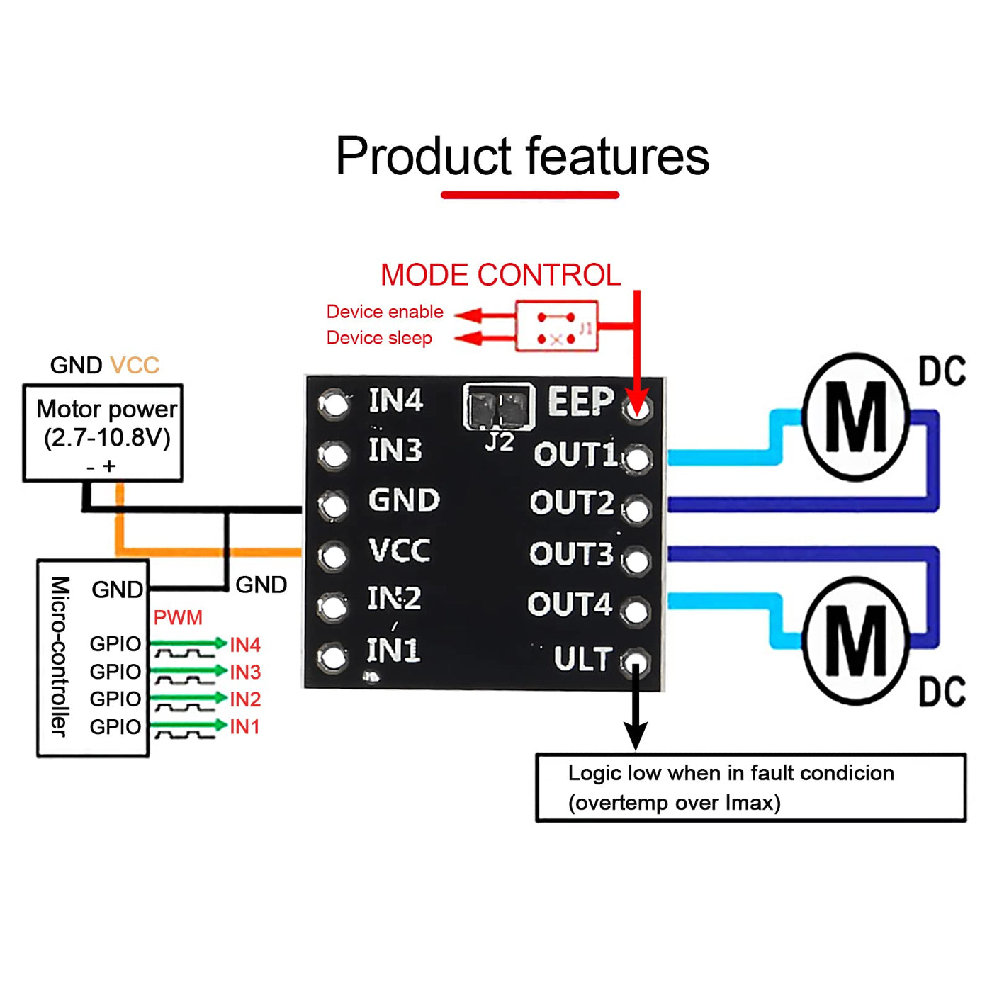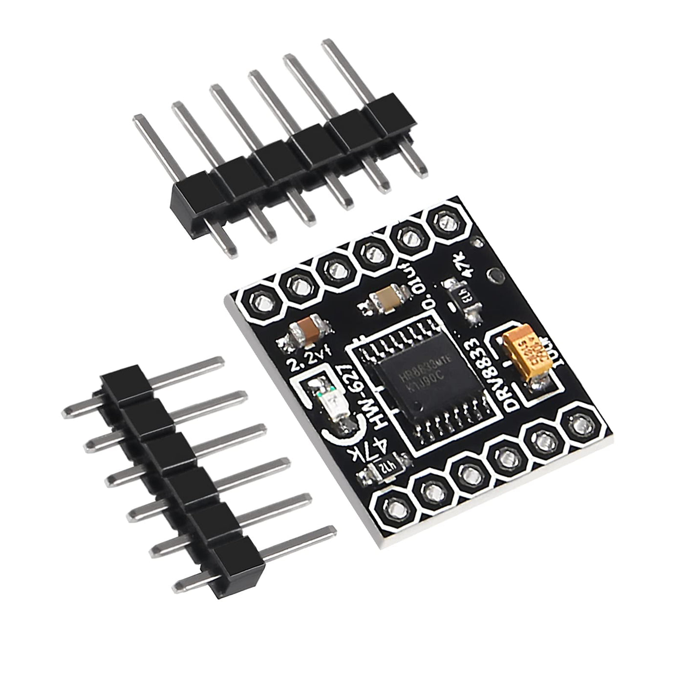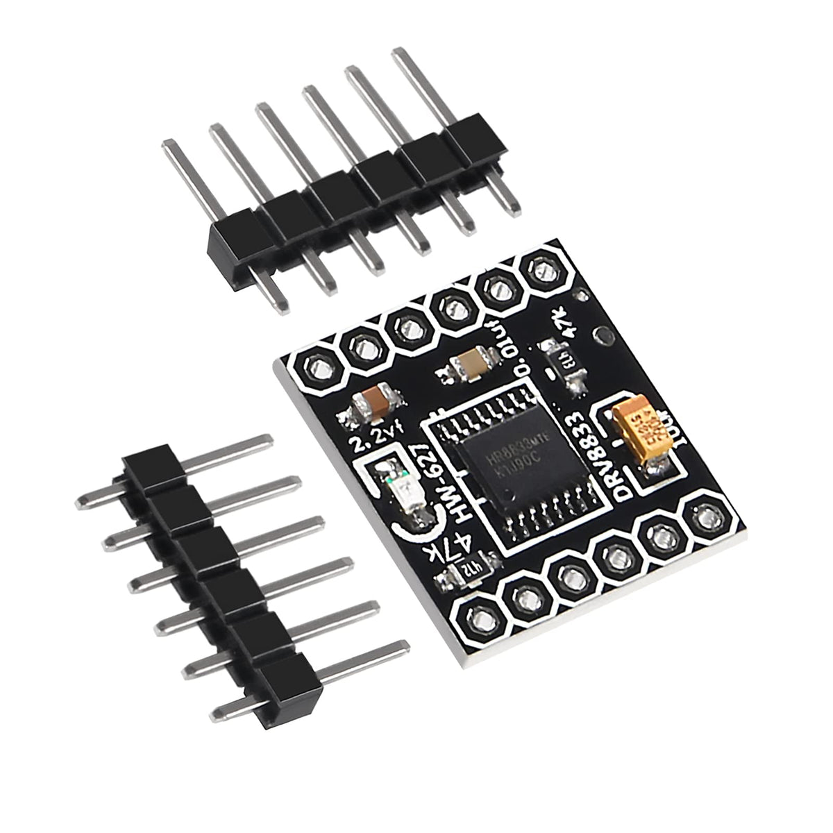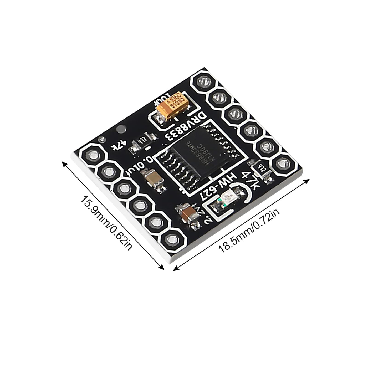 Description:1.Size: 18.4*16Mm2.Input Voltage:3V-10V3.Single H-Bridge Output Current: 1.5A( It Can Drive Two Dc Motor)4.Overcurrent Protection: Yes5.Short Circuit Protection: Yes6. Undervoltage Lockout: Yes7.Overheating Protection: Yes8.With A Low-Power Sleep Mode&Nbsp;Feature:1.Ult Pin: Mode Set. Low Level Is Sleep Mode2.Out1, Out2: 1-Channel H-Bridge Controlled By In1/In2.3.Out3, Out4: 2-Channel H-Bridge Controlled By In3/In44.Eep Pin: Output Protection. Default No Need To Connect.5.Vcc:3-10V&Nbsp;Directions For Useeep Low Level Is Sleep Mode(Need To Disconnect The J1 Short Contact Behind The Module, The Module Is Connected By Default And Connected To The High Level).Out1, Out2 Are H Bridges Of One Way, And Corresponding Control Of Points Is In1, In2.Out3 And Out4 Are The 2Nd H Bridge, And The Corresponding Control Is In3, In4.Ult Outputs For Protection Alarm, And Outputs Low Level Alarm Signals When Overheat And Overcurrent Protection Is In Effect.&Nbsp;Application:1.Dc Motor Which Drive Current Is Less Then 1.5A2.4-Wire Step Motor3.Single H Bridge Output Maximum Current Protection, Undervoltage Lockout And Overheat Protection. With Low-Powersleep Mode. 4.Use: Can Drive The Following 1.5A Dc Motor And 4- Wire Steppermotor&Nbsp;Package Included:10Pcs Drv8833 Motor Drive Module&Nbsp;