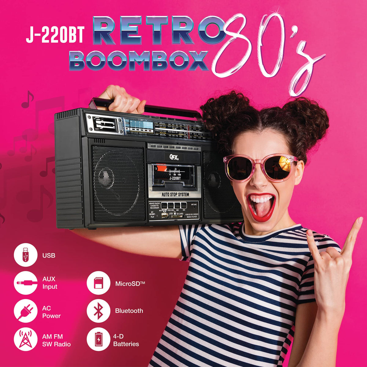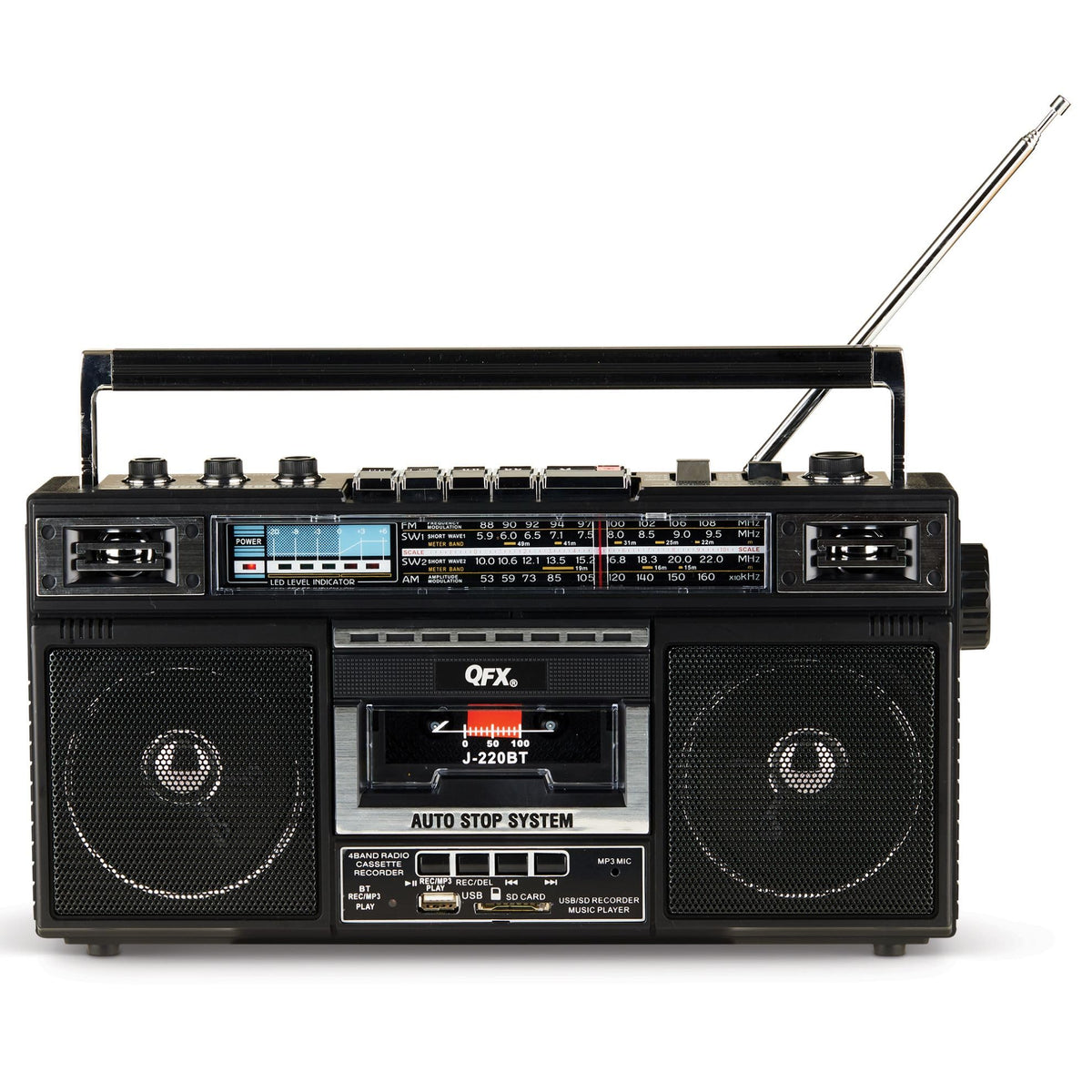 Don T Let The 3-Inch Speaker Size Fool You! The Qfx J-220Bt Is Equipped With Two 3-Inch Speakers That Provide You With Impeccable Sound Quality. You Will Also Be Able To Customize And Optimize The Sound By Utilizing The 3-Band Equalizer. Signal Reception Is The Single Most Important Feature For A Portable Radio. The Qfx J-220Bt Features A Telescopic Antenna For Increased Range And Signal So You Will Never Have To Worry About Being Without Reception While Listening To Your Favorite Station. With 4 Radio Bands Supported (Am, Fm, Sw1, Sw2) You Will Have A Plethora Of Listening Options! The Qfx J-220Bt Is A Convenient Gadget You Can Easily Transport With You Anywhere You Go. Equipped With A Swivel Handle And Weighing In At Under 4Lbs You Can Easily Carry The Qfx J-220Bt With You. The Qfx J-220Bt Is Equipped With All Of Your Input Needs. Connect Any Of Your Devices By Utilizing Bluetooth Connectivity. You Will Have Usb/Sd Ports At Your Disposal As Well As A Built-In Microphone And A Cassette Player To Maximize Which Tunes You Listen To. The Qfx J-220Bt Is Equipped With Usb/Sd Recording Capabilities. You Can Utilize This Feature By Inserting A Usb Or Sd Card Into The Device, Then Press The Rec/Del Button To Start Recording. The Rec/Mp3 Play Light Will Turn On. If You Want To Exit The Recording, Press The Rec/Del Button Again. The Qfx J-220Bt Goes Another Step Further And Allows You To Record A Cassette Tape, Radio Station, Or Voice Using The Built-In Microphone, Which Can Be Uploaded To The Usb Or Sd Card.With Three Decades At The Frontline Of Quality Electronics, Qfx Stands Firm In Its Commitment To Offer The Latest In Bluetooth Audio, Tailgating And Dj Speaker Systems, Led T.V.S, And Many Other Multimedia Solutions, Affording Budget-Focused Families, Businesses, And Everyone In Between, Industry-Leader Quality Without Breaking The Bank.Your Satisfaction Is Important To Us.