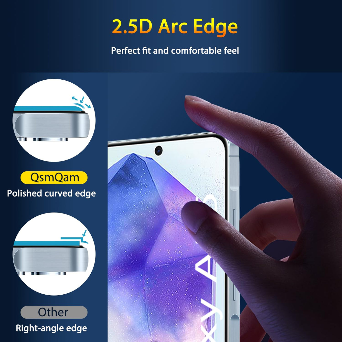 [Suitable Models] The Tempered Glass Screen Protector And Camera Lens Protector Are Specially Designed For Samsung Galaxy A55 Only. Not Suitable For Any Other Models. Protector De Pantalla Comes With An Aid Installation Frame That Quickly And Automatically Aligns And Fits The Screen Cover Perfectly To The Phone. | [Anti Scratch And Anti Shatter] Qsmqam'S Screen Protector Is Made Of High Quality 9H Hardness Tempered Glass That Is Scratch And Shatter Resistant In Daily Use. | [Hd And Touch Sensitive] The High Quality Tempered Glass With A Thickness Of Only 0.33Mm Has 99.99% Hd Clarity, Maintaining The Fast Responsiveness And Tactile Feel Of The Original Screen, Without Compromising The Original Hd Picture Quality For A Flawless Viewing Experience. | [Hand Comfort And Edge Curved Design] The Surface Of The Upgraded Protective Film Is Treated With Hydrophobic And Oleophobic Coating, Which Effectively Reduces Sweat, Fingerprints And Easy To Clean. Glass Shield 2.5D Curved Rounded Edge Design Makes Fingers And Hands Feel Comfortable. | [Package Included And After-Sales Service] 3 * Screen Protectors, 3 * Camera Lens Protector, 3 * Cleaning Kits ,1 * Installation Frame. We Have An Excellent After-Sales Team And Your Questions And Feedback Will Be Answered Within 12 Hours.