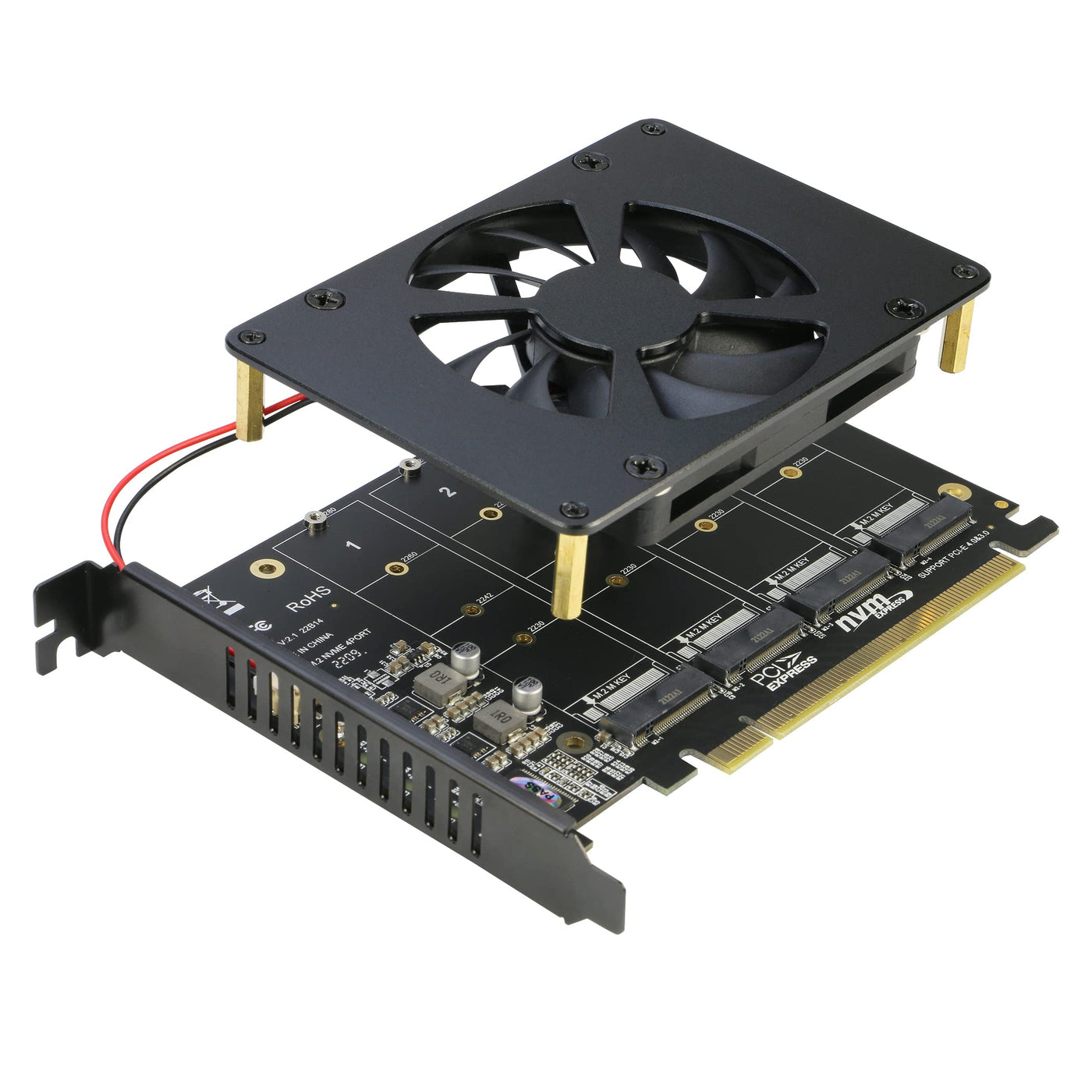 Quad Nvme Pcie Adapter, Riitop 4 Ports M.2 Nvme Ssd To Pci-E 4.0/3.0 X16 Card With Fan Support 2280/2260/2242/2230 Nvme Ssd (Pci