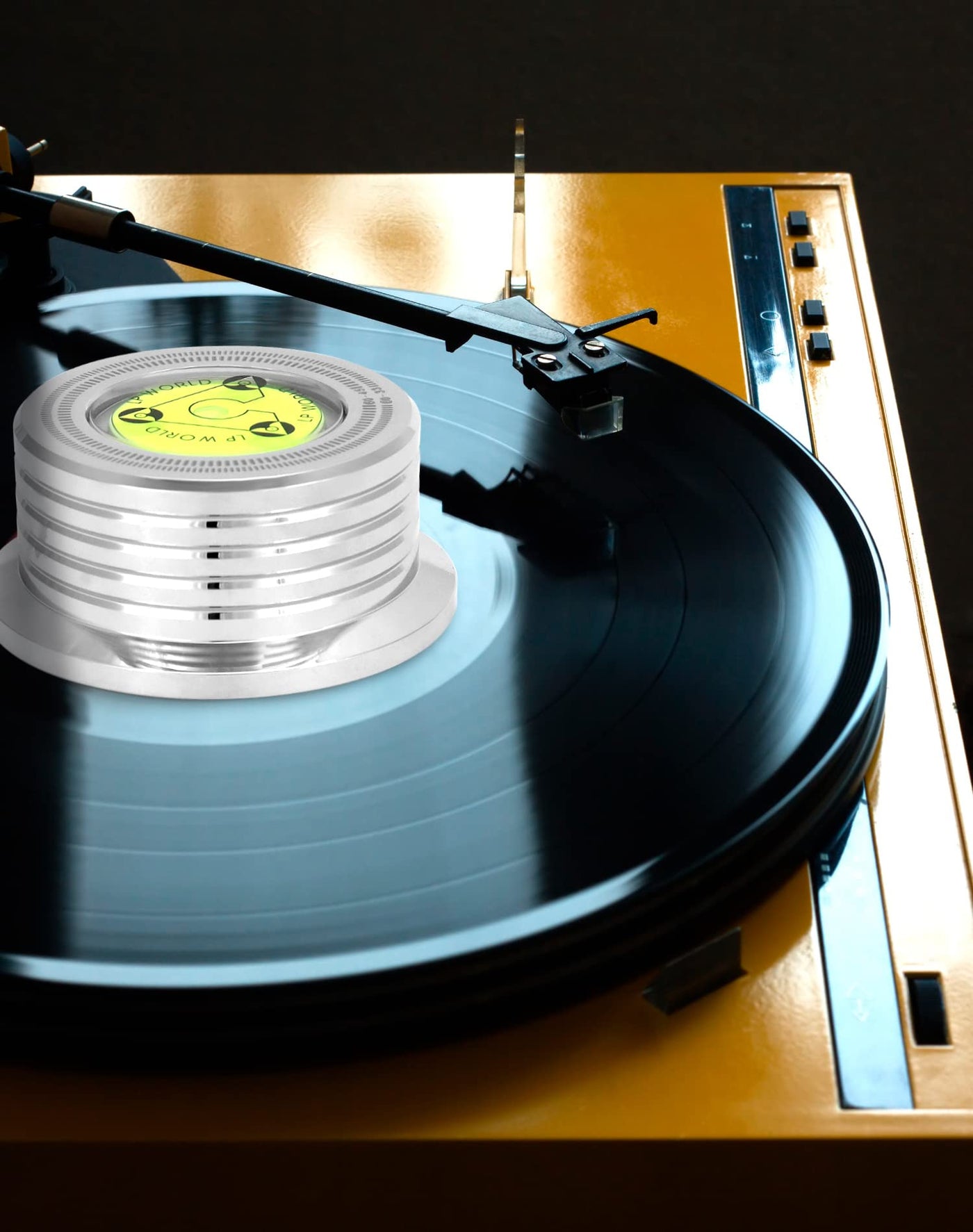 Q: What materials are used in the construction of this stabilizer?A: The QWORK Record Weight is crafted from high-quality aluminum, providing durability and a stylish chrome finish. This construction not only enhances its aesthetic appeal but also ensures it effectively reduces vibrations without overloading the turntable bearing.