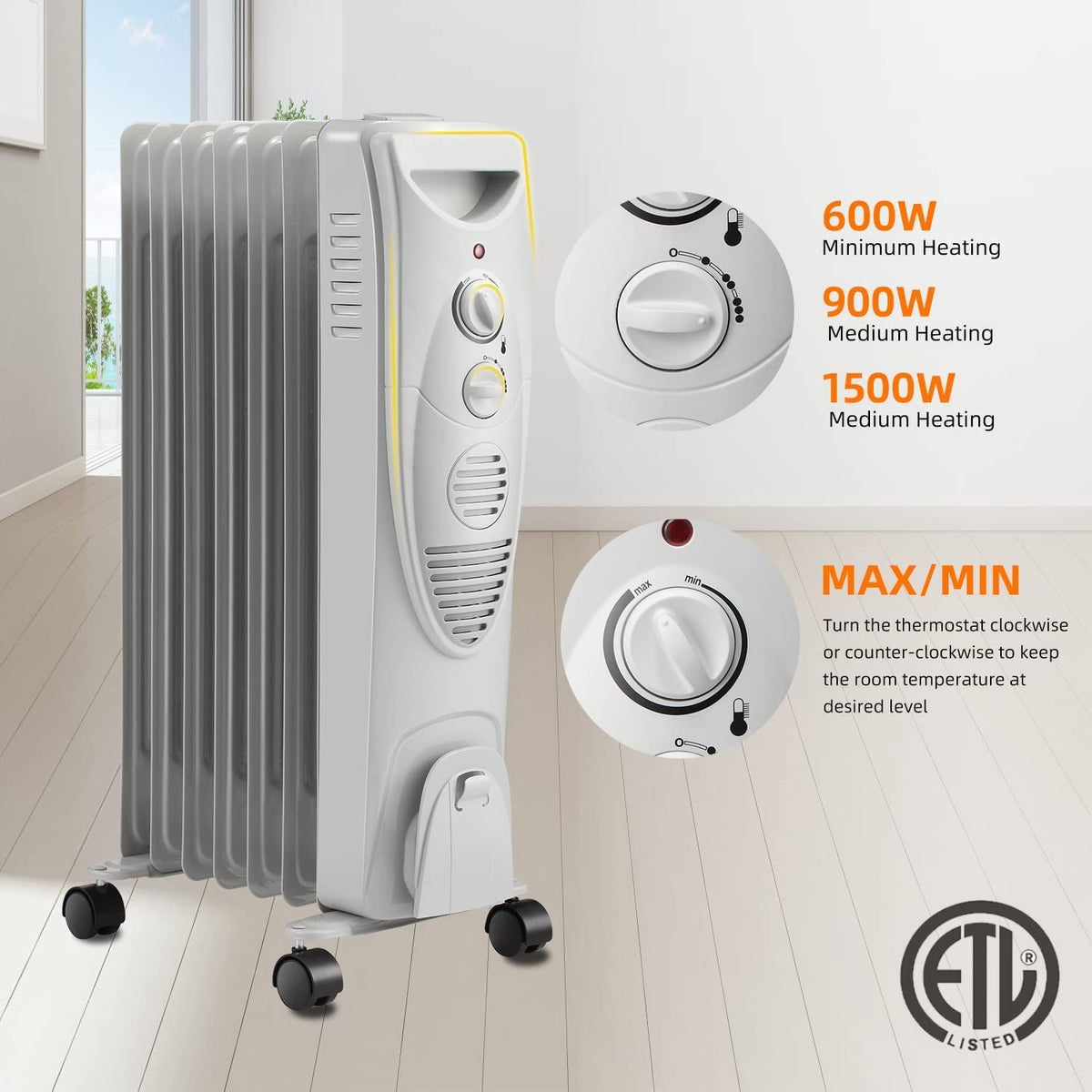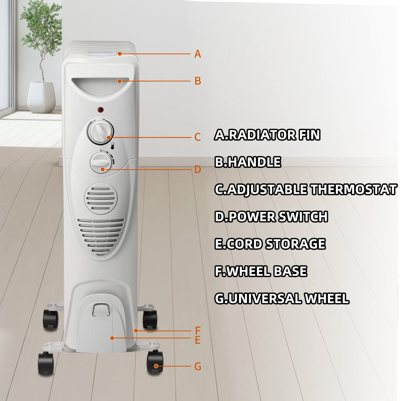 High Efficiency Heating:R.W.Flame Radiator Heater Adopts Strong Convection Heating Technology To Heat The Cold Air To Form A Circulating Warm Air Flow, So That The Room Is Evenly Heated. In Addition, The Oil Filled Heater Generates A Lot Of Radiant Heat, But The Surface Temperature Is Low, Which Is A Wise Choice For Families With Pets Or Children. | Quiet And Comfortable: This Indoor Heater Heats The Space By Heating The Special Oil Inside, Making Your Skin Comfortable Without Drying And Providing You With Continuous Warmth. No Fan Noise And Operating Noise, Suitable For The Office, Bedroom And Other Places, For Work, Reading, Sleep To Provide A Quiet And Peaceful Warm Space. Sleeping. | Easy To Operate And Maintain: Equipped With 600W/900W/1500W Three Power Supply Settings.The Oil Tank Has The Function Of Constant Temperature Regulation, Which Is Suitable For Different Occasions Such As Home, Office And Bedroom.Plus, The Heater Is Easy To Clean And You Don'T Need To Disassemble It. | Tip-Over Protection: You Don'T Need To Worry About Safety Issues When Using The Oil Tank At Home, As This Radiator Will Automatically Turn Off If You Trip Over Your Pet Or Children. | Easy To Move: The Oil Tank Heater Is Equipped With Four Casters For Easy Movement.You Can Put It In Every Corner Of Your House, Such As The Kitchen, Bedroom Or Living Room.