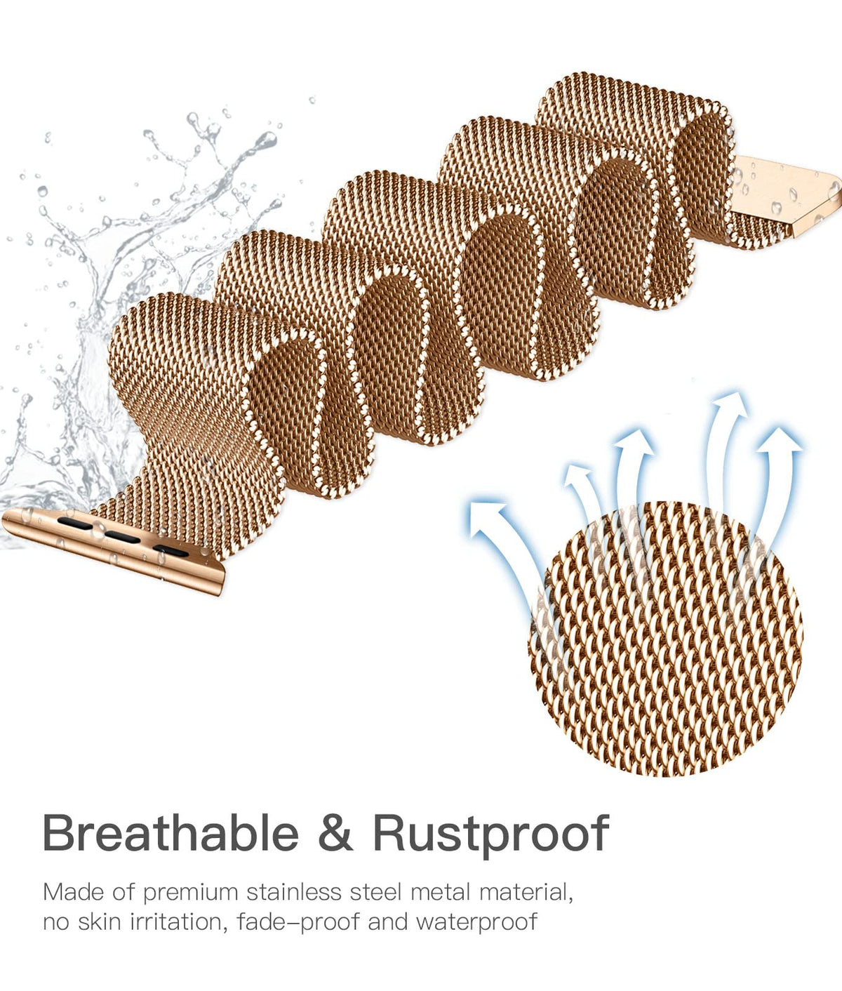 Q: What materials are used in the Rabini stainless steel watch band?A: The Rabini watch band is crafted from premium stainless steel metal, making it flexible, sturdy, waterproof, rustproof, and fade-proof. Its advanced mesh weave allows for breathability, ensuring comfort during daily wear and activities.