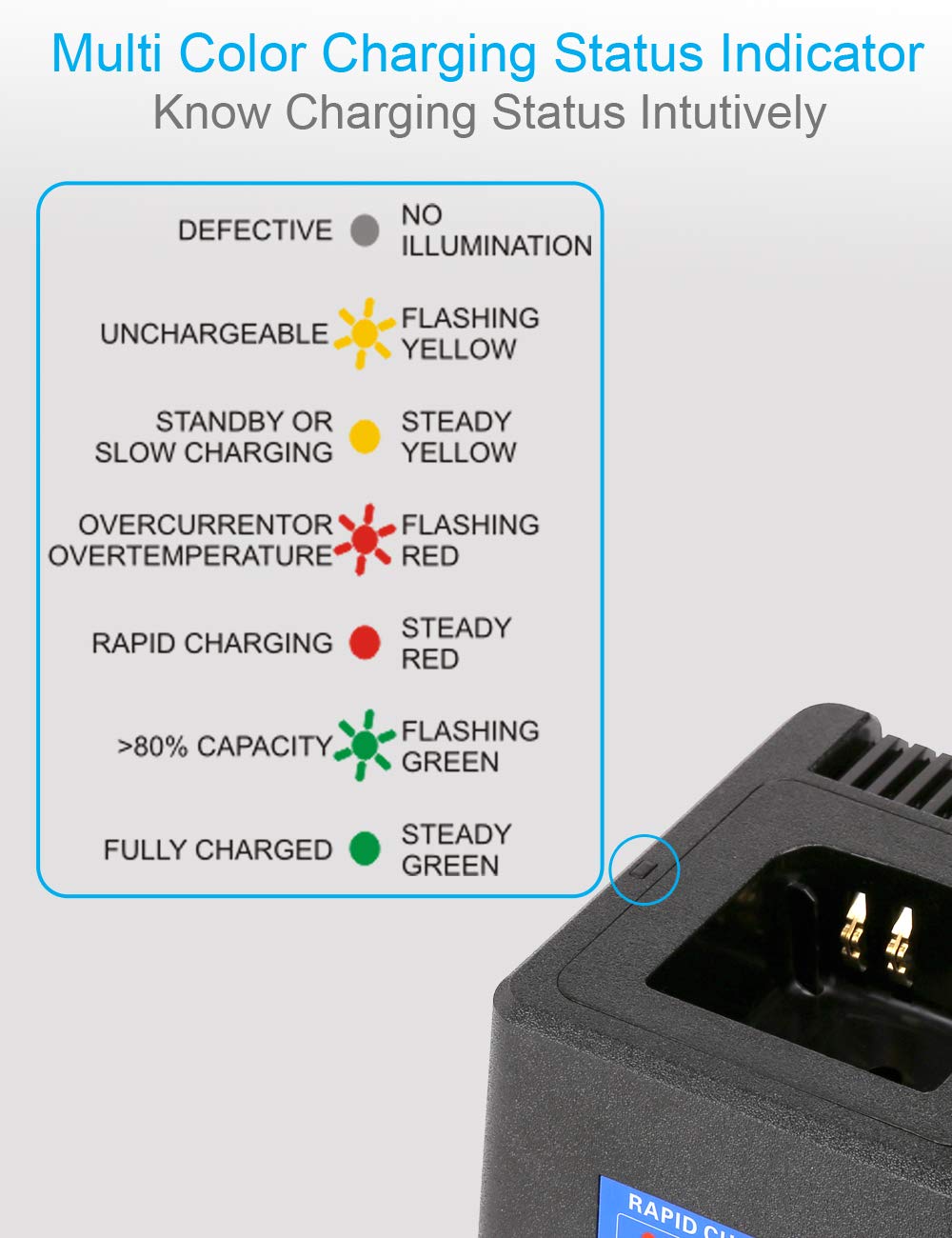 Specifications: System: Tri-Chemistry Single Unit Rapid Charger Housing: Flame Retardant Pc/Abs Battery Chemistry: Nickel-Cadmium (Ni-Cd), Nickel-Metal-Hydride(Ni-Mh), Lithium-Ion (Li-Ion), Lithium-Polymer(Li-Polymer) Temperature Management: Nickel-Based: 0�C-50�Clithium-Based: 0�C-45�C. Charge Current: 800Ma-1500Ma Battery Mah/V: 500Mah-4000Mah Light Signals: Flashing Yellow: Un-Chargeable Battery Flashing Red: Over-Current Or Over-Temperature Steady Yellow: Battery Is In Slow Charge Mode Or In Pre-Charge Mode And Waiting For Rapid Charge Steady Read: Rapid Charging Flashing Green: Charged About 80% Capacity Steady Green: Full Charged Cooling: Natural Cooling Electrical: Input: 100-240V 50/60Hz 0.5A Max Output: 5-12V 1.5A (24W 16Vx1.5A Switching Power Adapter) Approvals: Ce(Emc,Lvd), Fcc, Rohs Environmental: Operating Temperature: 0�C To +40�C (32�F To +104�F) Storage Temperature: -30�C To +70C (-22 To +158�F) Dimension: 4.7X4.3X2.6 Inch (Charger Base Only) Net Weight: 1.05 Lbs Package: Parper Carton, Include One Charger Base And One Power Adaptor Warranty: 3 Year Warranty On Parts And Labor