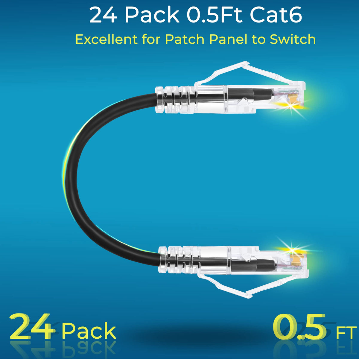 Rapink Patch Cables Cat6/ Cat6A 0.5Ft (24 Pack) Slim, Cat6A Ethernet Patch Cable 10G Support, Snagless Cat 6 Patch Cable For Patch Panel To Switch, Flexiable Cat6 Ethernet Cable Black