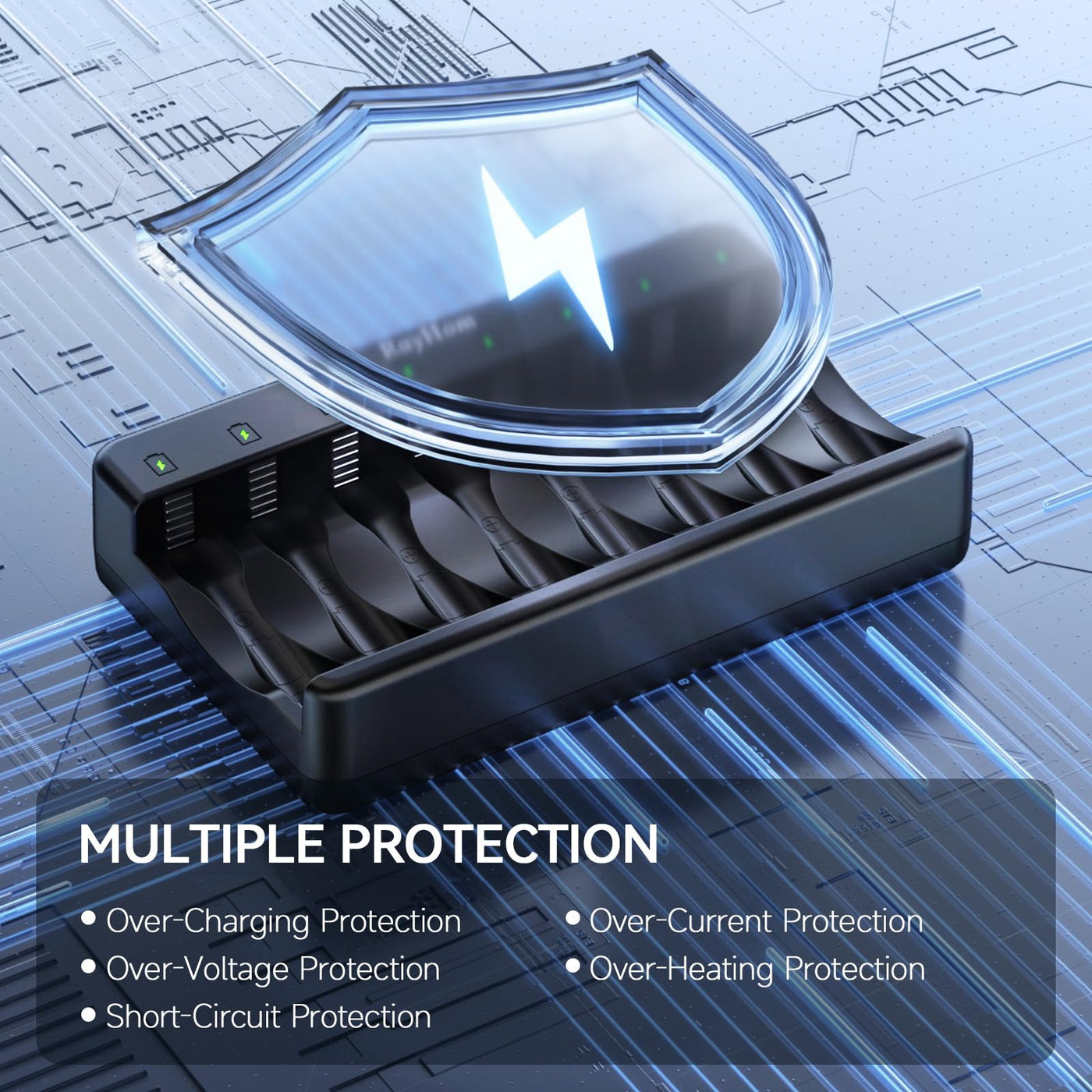 ?2 Pack Chargers?You Get Two 8-Bay Aa Aaa Chargers In One Purchase. Sharing A Charger With Your Friend Is An Encouraging Behavior, Or You Can Simultaneously Charge 16 Batteries For Family Home Use. ?Hybrid Charging Mode?Rayhom Universal Battery Charger Supports Hybrid Charging And Supports 8 Pcs Aa/Aaa Rechargeable Batteries Charging At The Same Time, Saving A Lot Of Charging Time For You. ?Smart Led Display?Clear Led Indicator Light, Red Indicates Charging, Green Indicates Fully Charged, And Flashing Alternating Red-Green Indicates Incorrect Or Faulty Batteries. ?Type-C Charging Port?Type C Port Is Suitable For All Kinds Of Interface Input, Such As Pc/Plug/Power Bank/Car Charger, Charging Anytime And Anywhere. Good Compatibility Enables Various Power Adapters, 1.0A/2.0A/3.0A Adapters Can Be Used As You Please. ?Safety Protection?Controlled By Mcu And Multiple Protection, Overcharging, Overcurrent, Overvoltage, Overheating, Short Circuit Protection. Constant Current Charging Protects The Batteries From Current Fluctuations.