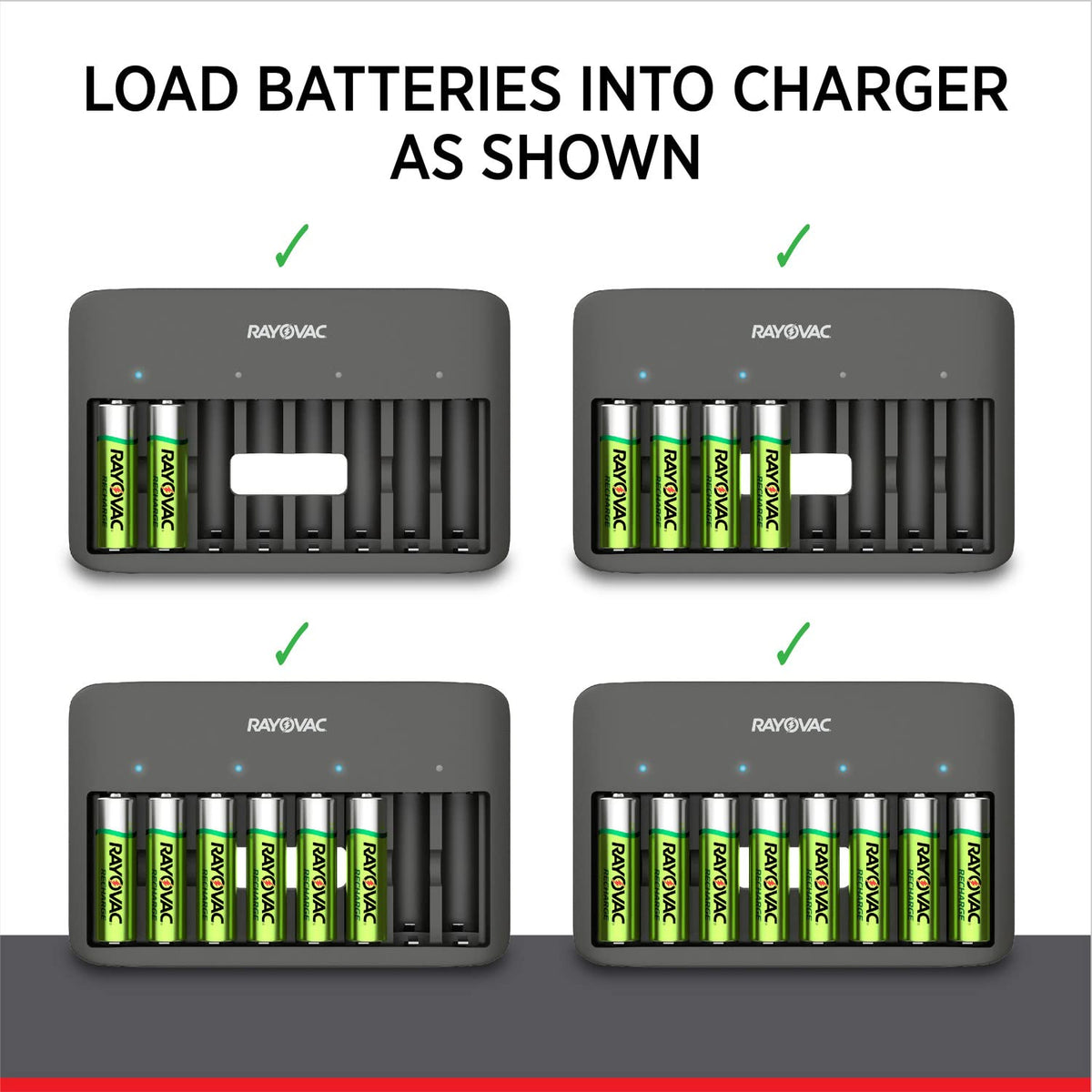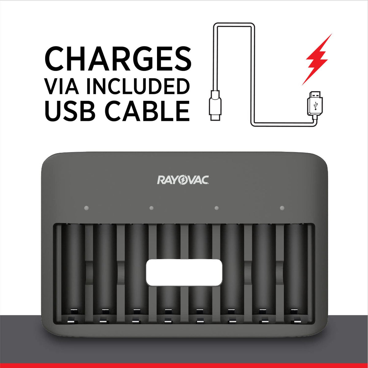 Quickly Charge Aa And Aaa Rechargeable Batteries With The Rayovac Usb Battery Charger. The Convenient Charger For Batteries Features Green Leds That Indicate When Charging Is Complete Or Batteries Are Not Inserted So You Can Keep Tabs On Charging Status. Designed For Aaa And Aa Rechargeable Batteries, The Rayovac Usb Battery Charger Is Equipped With Automatic Shut-Off To Prevent Overcharging And Help Maximize Battery Capacity. Completely Charge Up To 8 Aa Or Aaa Nimh Batteries Simultaneously With The 8 Bay Rechargeable Batteries Charger In As Little As 7 Hours (Times May Vary By Nimh Battery).