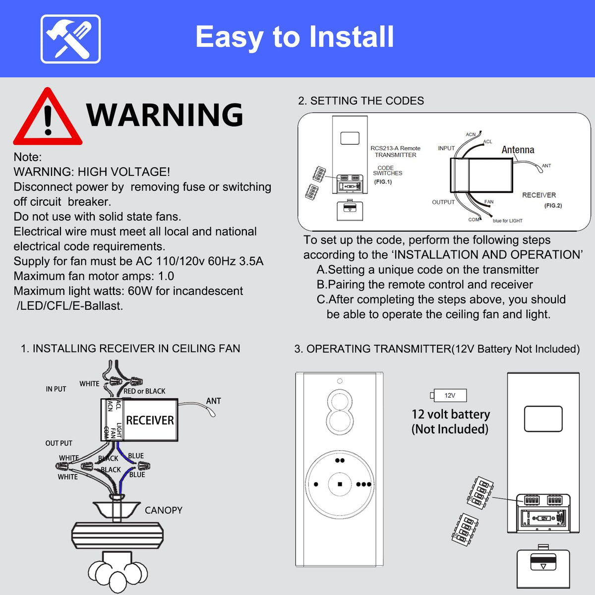 Q: How do I install the RCS213-A remote control kit?A: To install the RCS213-A remote control kit, refer to the included installation manual. Install the receiver in the ceiling fan's canopy, set the dip switches on the remote to match the receiver, and pair the remote with the receiver for operation.