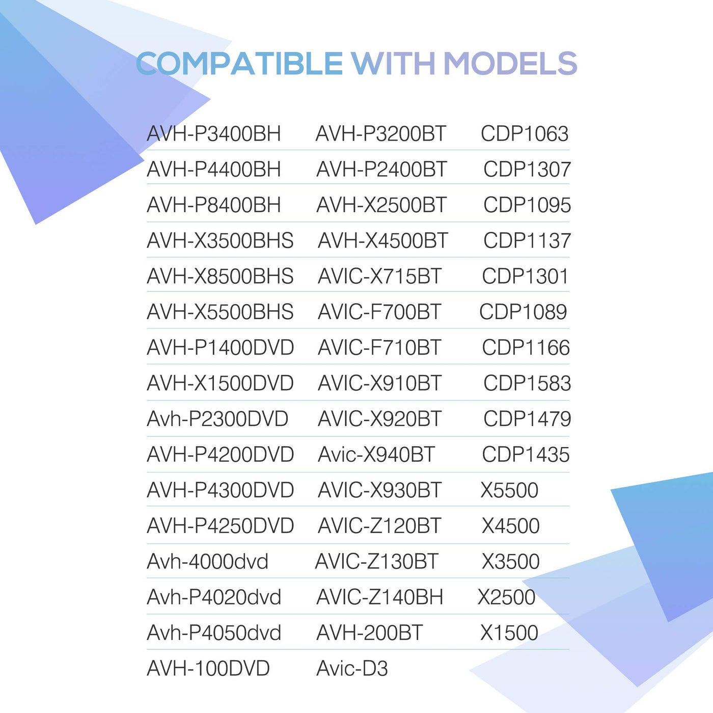 Cdp1435 Avh-X8500Bhs, X5500, X4500, X3500, X2500, X1500 Avh-P1400Dvd, Avh-P2400Bt, Avh-P3400Bh, Avh-P4400Bh, Avh-P8400Bh, Avh-X1500Dvd, Avh-X2500Bt,Avh-X3500Bhs, Avh-X4500Bt, Avh-X5500Bhs, Avh-X8500Bhs, Avhp1400Dvd, Avh-P2400Bt, Avh-P3400Bh,Avh-P4400Bh, Avh-P8400Bh, Avh-X1500Dvd, Avh-X2500Bt, Avh-X3500Bhs, Avh-X4500Bt, Avh-X5500Bhs, Avh-X8500Bhs, Cdp1063 , Cdp1307 ,Cdp1095 , Cdp1137 Avic-D3 Avic-F700Bt Avic-F710Bt Avic-X715Bt Avic-F7010Bt Avic-X7115Bt, Avic-X910Bt Avic-X920Bt Avic-X930Bt Avic-Z120Bt Avic-Z130Bt Avic-F900Bt Avic-F910Bt Avic-F90Bt Avic-F9115Bt Avic-Z110Bt, Avic-D3 Avic-F700Bt Avic-F710Bt Avic-X715Bt Avic-F7010Bt Avic-X7115Bt Avic-F900Bt Avic-F910Bt Avic-F90Bt Avic-F9115Bt Avic-Z110Bt Avic-X910Bt Avic-X920Bt Avic-X930Bt Avic-Z120Bt Avic-Z130Bt, Avh-P2300Dvd , Avh-P3200Bt, Avh-P4200Dvd , Avh-P4300Dvd , Avh-P4250Dvd Cdp1301 Cdp1089 Cdp 1166 Avh-P4000 P4400 P8400 P2400 Avh-4000Dvd ,Avhp4020Dvd Avh-P4050Dvd , Avh-P1400Dvd, Avh-P2400Bt, Avh-P3400Bh, Avh-P4400Bh, Avh-P8400Bh, A Avhp1400Dvd, Avh-P2400Bt, Avh-P3400Bh,Avh-P4400Bh, Avh-P8400Bh, Cdp1583 Avh-100Dvd Avh-200Bt, Cdp1479, Avic-X940Bt, Avic-Z140Bh, Avic-X910Bt, Avic-X920Bt, Avic-X930Bt, Avic-Z120Bt, Avic-Z130Bt, Cdp1435 Avh-X8500Bhs, X5500, X4500, X3500, X2500, X1500 Avh-P1400Dvd, Avh-P2400Bt, Avh-P3400Bh, Avh-P4400Bh, Avh-P8400Bh, Avh-X1500Dvd, Avh-X2500Bt,Avh-X3500Bhs, Avh-X4500Bt, Avh-X5500Bhs, Avh-X8500Bhs, Avhp1400Dvd, Avh-P2400Bt, Avh-P3400Bh,Avh-P4400Bh, Avh-P8400Bh, Avh-X1500Dvd, Avh-X2500Bt, Avh-X3500Bhs, Avh-X4500Bt, Avh-X5500Bhs, Avh-X8500Bhs, Cdp1063 , Cdp1307 ,Cdp1095 , Cdp1137 Avic-D3