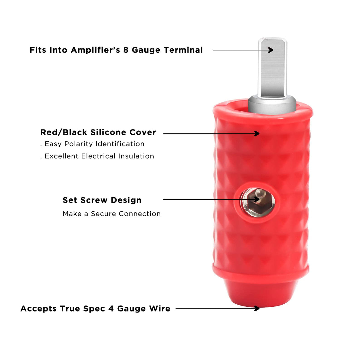 Reduce Amplifier Input 4 Gauge Wire To A 8 Gauge Size. Sold In Pair (2) Includes Red/Black Silicone Covers