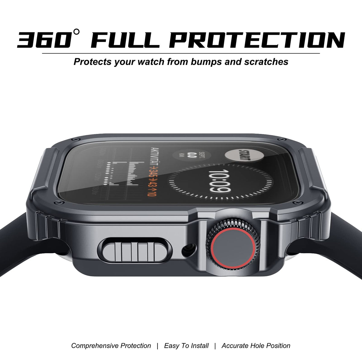 Q: How does the screen protector work with my Apple Watch?A: The built-in 9H tempered glass screen protector fully covers the watch screen and curved edges, ensuring responsive touch sensitivity and protection against scratches and drops.