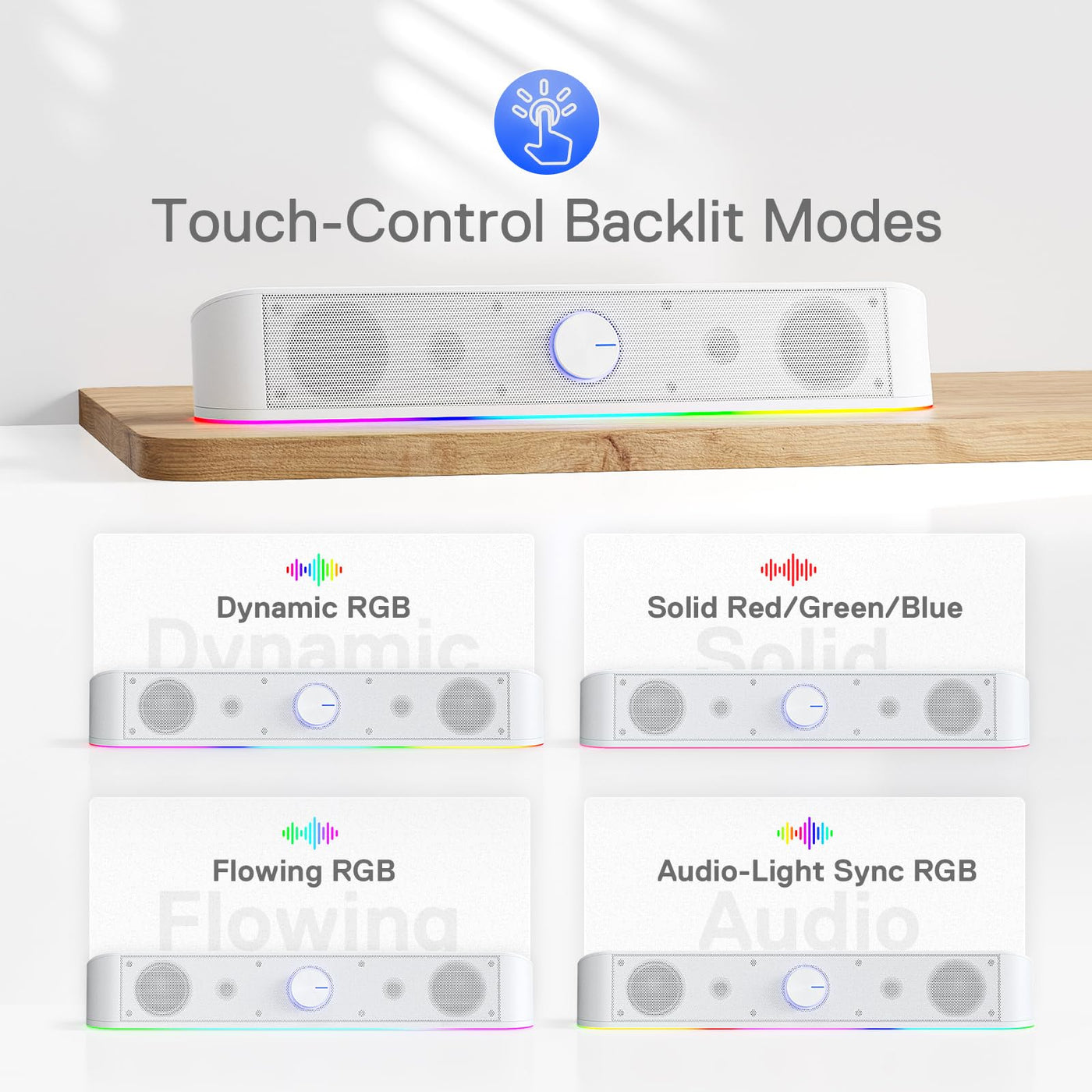 Redragon Gs560 Rgb Desktop Soundbar, 2.0 Channel Computer Speaker With Dynamic Lighting Bar Audio-Light Sync/Display, Touch-Control Backlit With Volume Knob, Usb Powered W/ 3.5Mm Cable, White